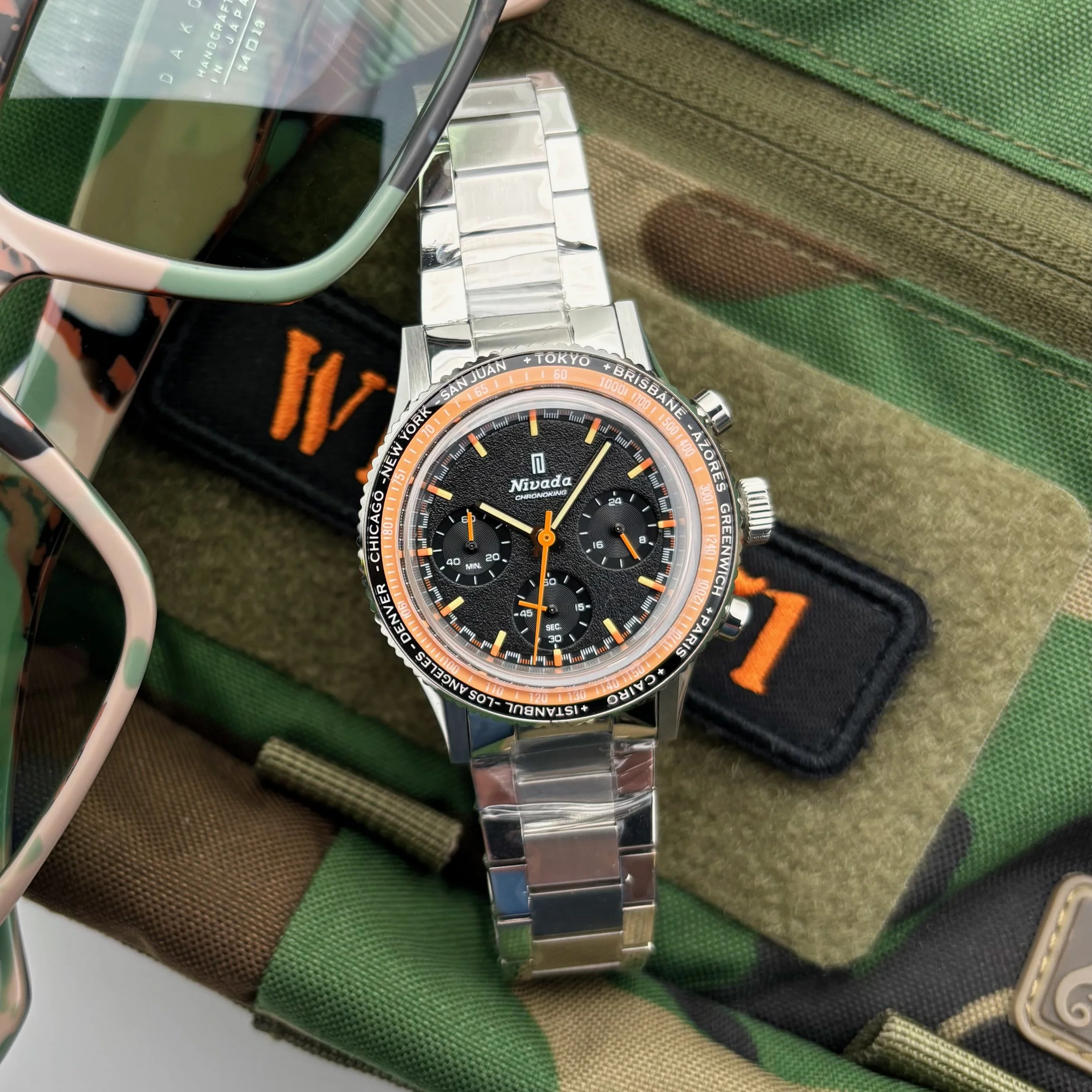 Sporty and striking, this version of the Chronoking Mecaquartz Inter.Bezel captures the spirit of the 1970s racing with a contemporary twist. Powered by the Swiss-assembled TMI VK63 meca-quartz movement, it blends quartz precision with a smooth, mechanical-style chronograph sweep. Encased in a 38mm stainless steel case, this timepiece features a matte black textured dial with bold orange printed indexes and an embossed logo, giving it a striking visual appeal. Combined with interchangeable bezels, it adapts to every mood and occasion.—exactly the kind of balance the Guarded Crown squad appreciates. Vintage charm, modern versatility—this is a chronograph that keeps it clean while still knowing how to stand out.
