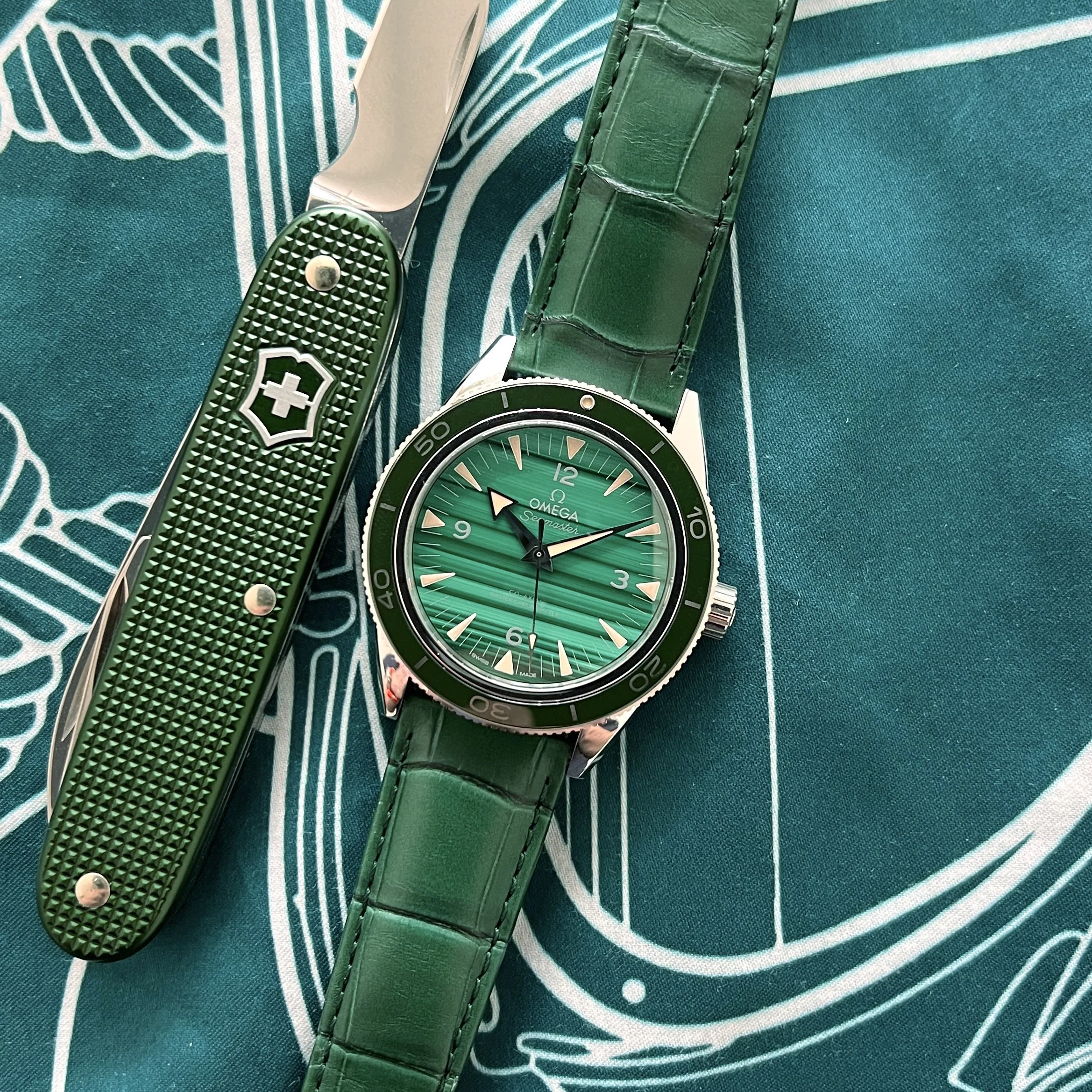 We are pleased to offer this beautiful, unworn New-Old-Stock Omega Seamaster 300 Chronometer with the reference 234.93.41.99.001. This timepiece has a 41mm case made from platinum surrounding a unidirectional rotating green ceramic bezel with a platinum Liquidmetal diving scale, with a display caseback to highlight the beautiful Master Chronometer Calibre 8913 movement. The dial has a gorgeous deep green color made from the precious stone malachite. The vintage Super-LumiNova filled dial features 18k white gold minute, second, and hour hands, and is presented with a green leather strap. An interesting touch about this watch is the movement. Calibre 8913 was certified at the industry’s highest standard by the Swiss Federal Institute of Metrology (METAS). This 60 hours power reserve movement is magnetic resistant, and features a rotor finished in Omega’s 18k Sedna Gold. There is a domed, scratch-resistant sapphire crystal with anti-reflective treatment inside, and has a water resistance rating of 30 bar (300 meters / 1000 feet). This watch will ship complete with the outer box, display box, Operating Instructions book, International Warranty card, Master Chronometer card and Pictograms card. The Warranty card is dated in April of 2022.