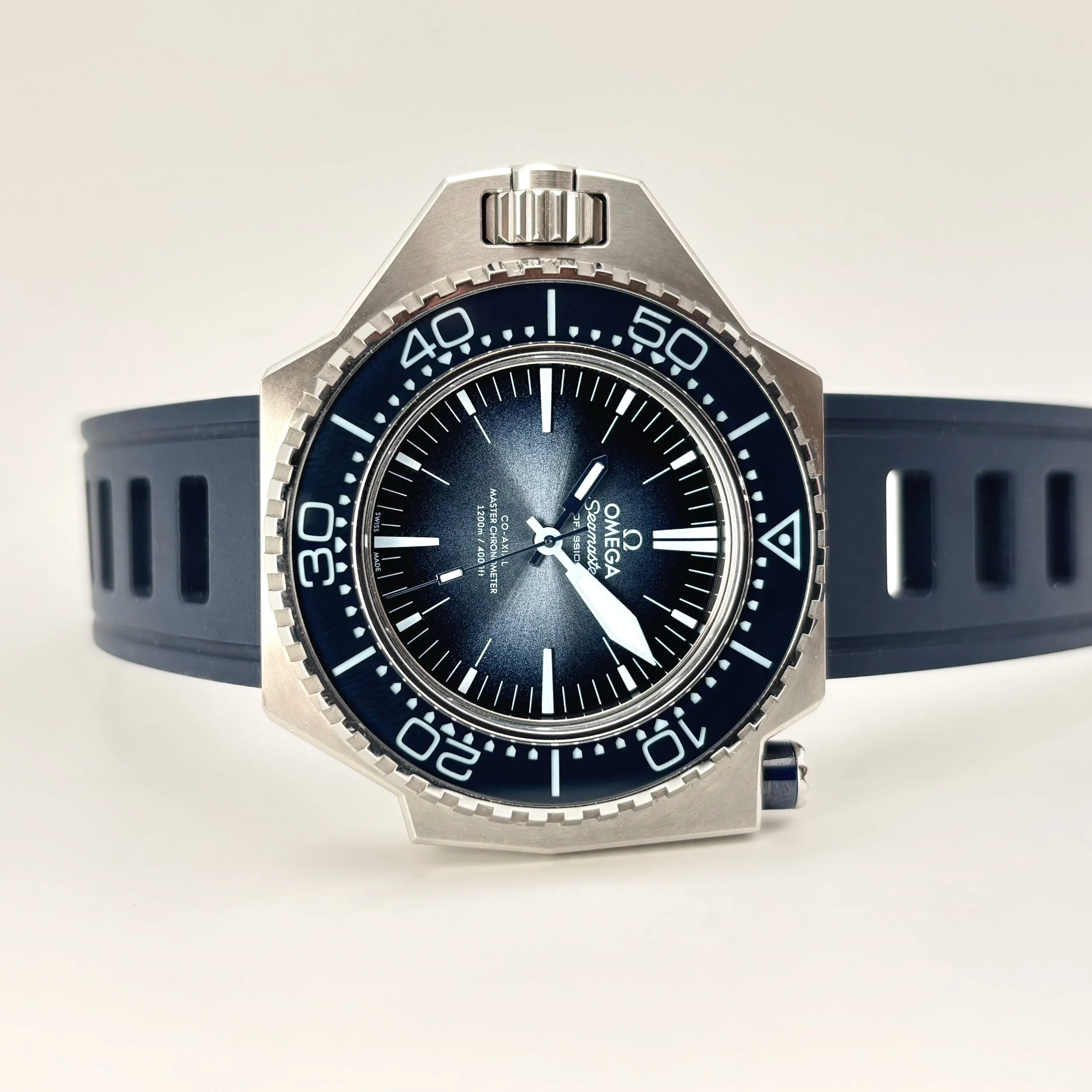 A legend reimagined - The Omega Seamaster Ploprof 1200M, reference 227.32.55.21.03.001, takes deep-sea tool watch heritage and gives it an electrifying and bold modern twist. Crafted in ultra-durable O-MEGASTEEL, its monobloc case, signature security pusher at the 2 o’clock position, and transparent sapphire bezel shout purpose — but it’s the sun-brushed Summer Blue gradient dial and luminous blue details that steal the show.
