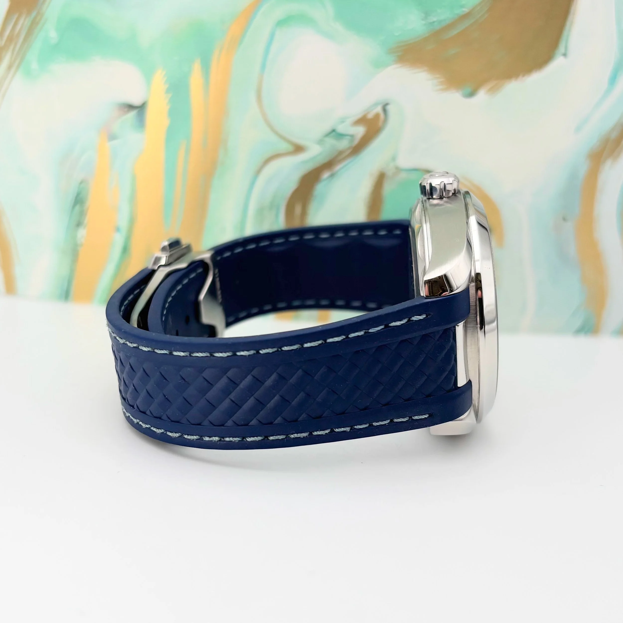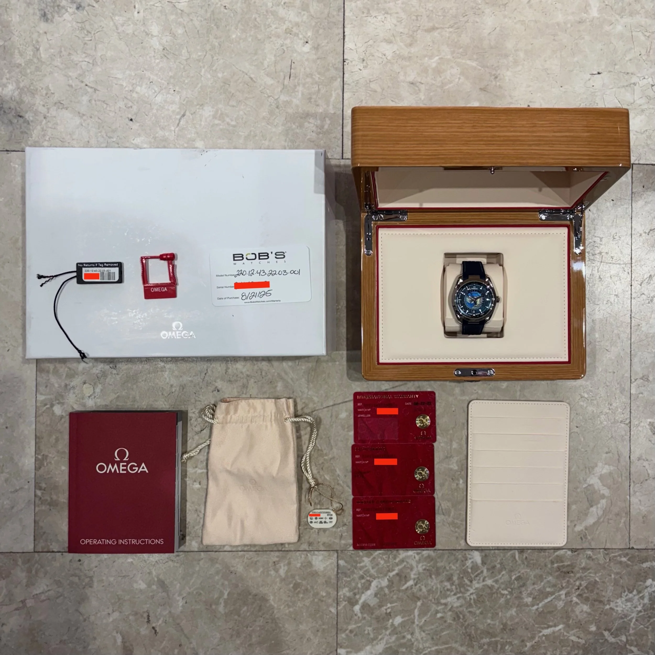 We are pleased to offer this preowned Omega 43 mm Worldtimer with Reference 220.12.43.22.03.001. This piece includes a polished case in stainless steel which is integrated with the structured blue rubber strap via a solid polished link. The condition of this timepiece is very good, with minor superficial scratches on the case, bezel and clasp. The exterior section of the dial is sun-brushed blue and includes vertical teak stripes and a circle of global destinations printed in red (GMT), silvery (+1h in summer) and blue (places without daylight savings).