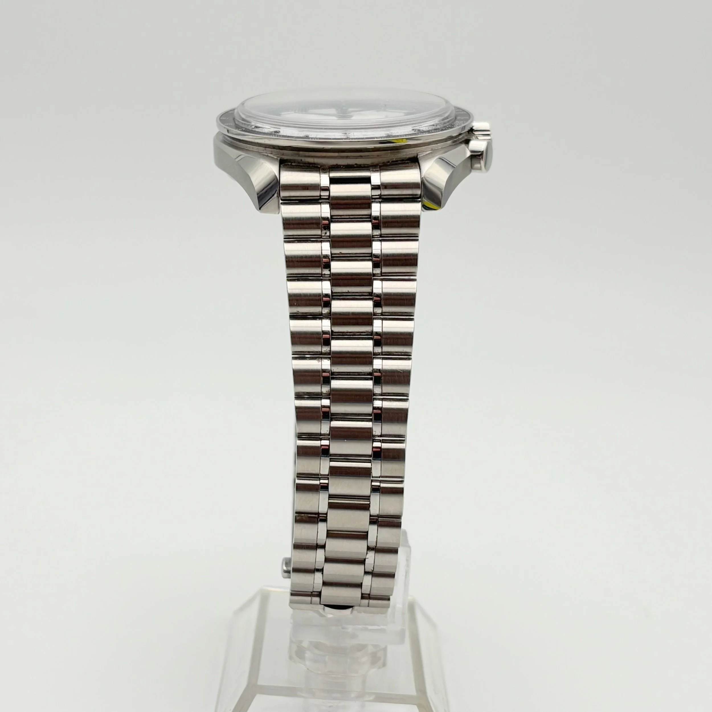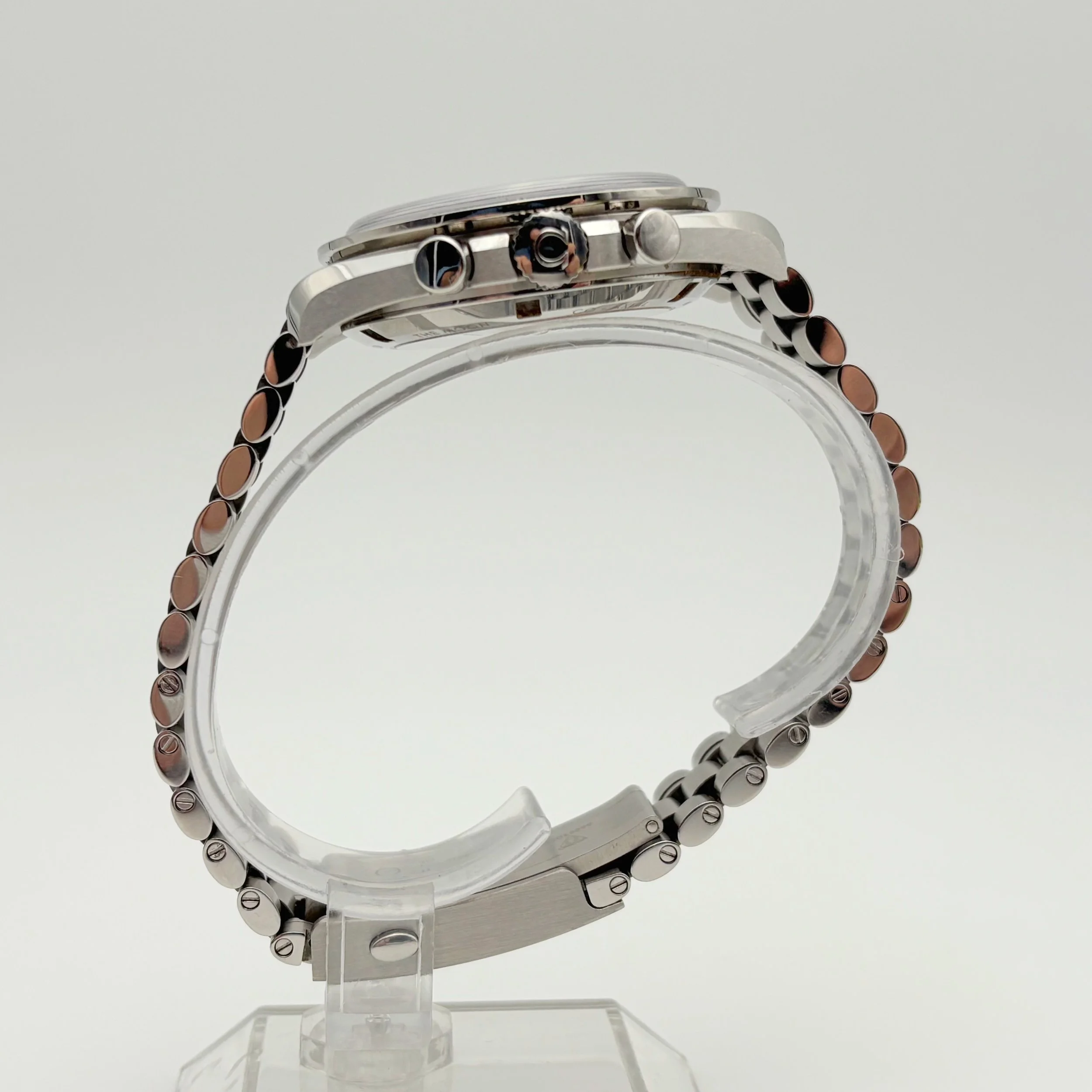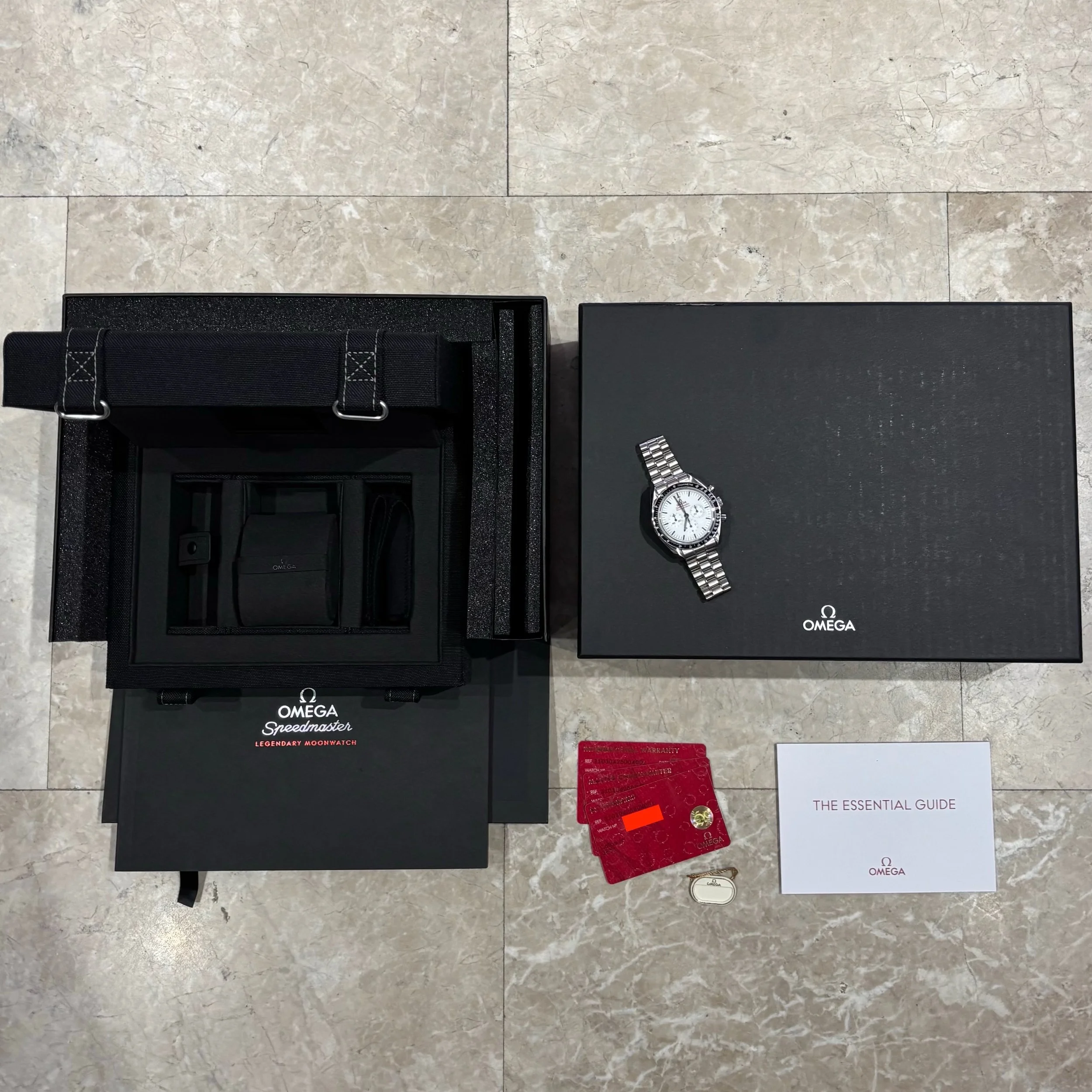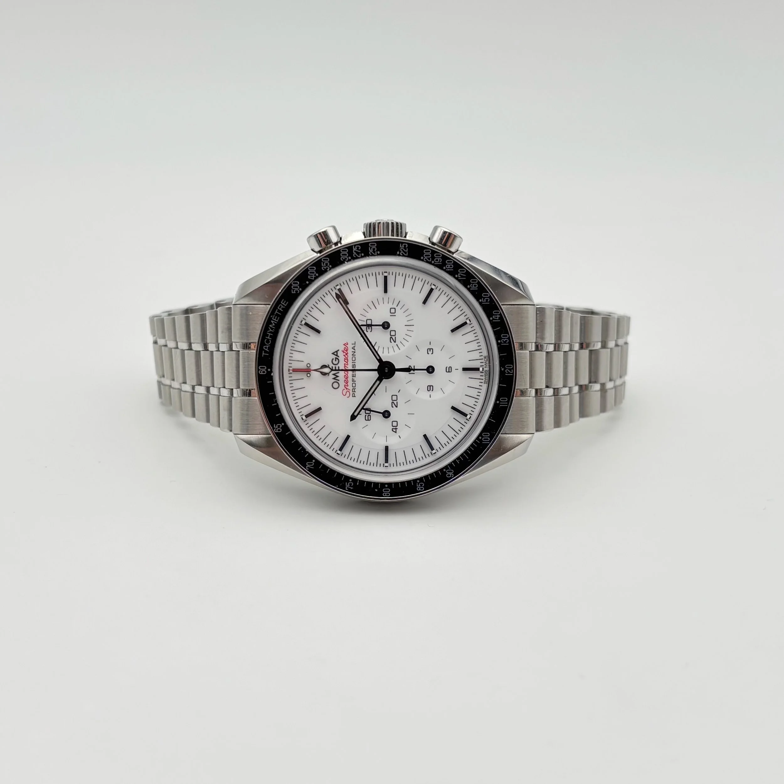 We are pleased to present this Omega Speedmaster Professional Moonwatch, reference 310.30.42.50.04.001, featuring the striking white step dial with black accents. This model pairs the iconic Speedmaster design with the modern Master Chronometer–certified Caliber 3861, offering exceptional accuracy, anti-magnetic performance, and a smooth manual-wind experience. The watch comes on the updated stainless-steel bracelet with its comfortable taper and solid clasp. The white dial gives this Moonwatch a fresh, contemporary look while preserving the heritage that makes the Speedmaster so collectible. The condition of this watch is good, with the exception of superficial scratching throughout the case and bracelet. This watch will ship with an OMEGA outer box, inner display case with built-in travel case, dust cloth, OMEGA Speedmaster Moonwatch book, The Essential Guide, International Warranty card, Pictograms card, and Master Chronometer card (dated in March 2025). This piece has a Sapphire crystal and caseback.