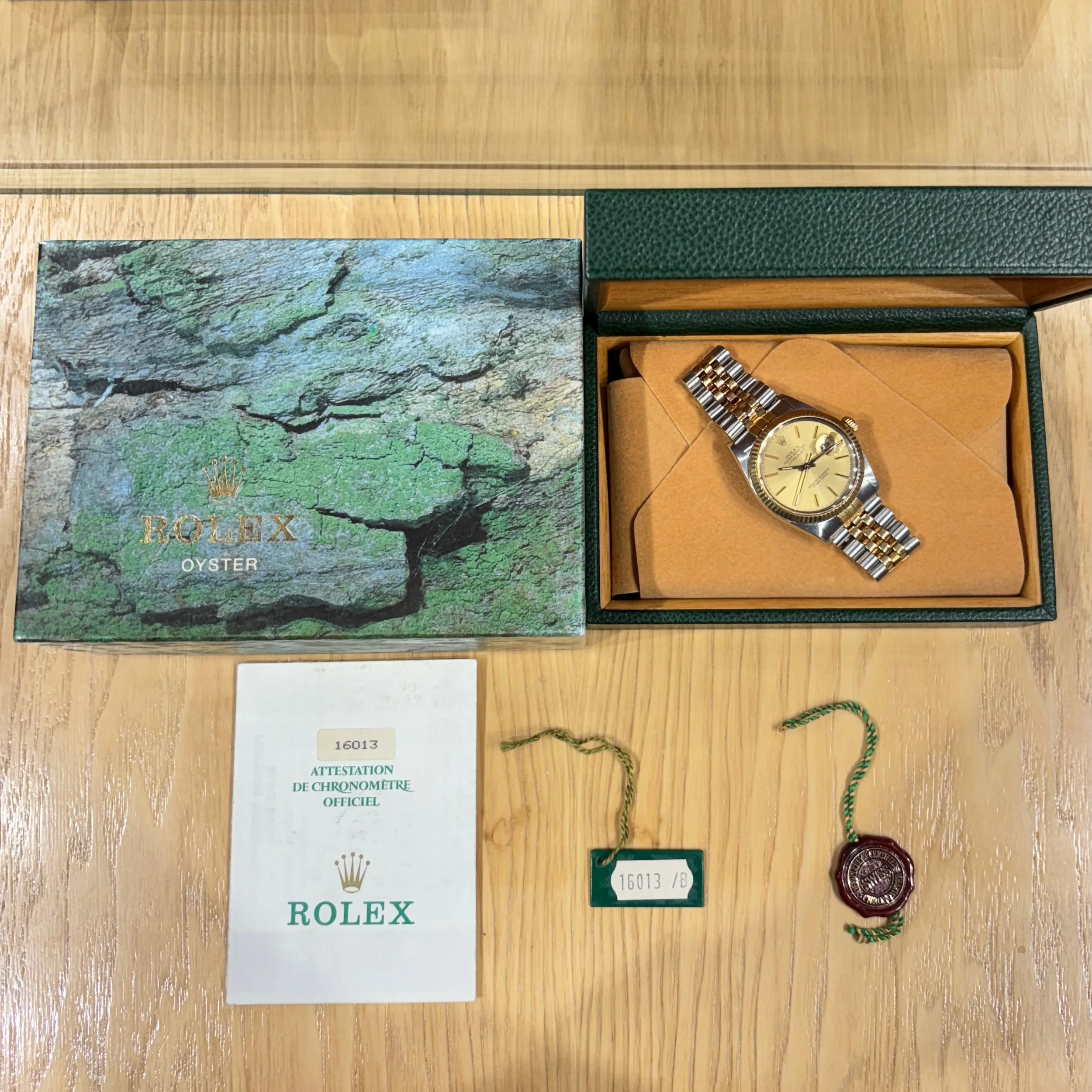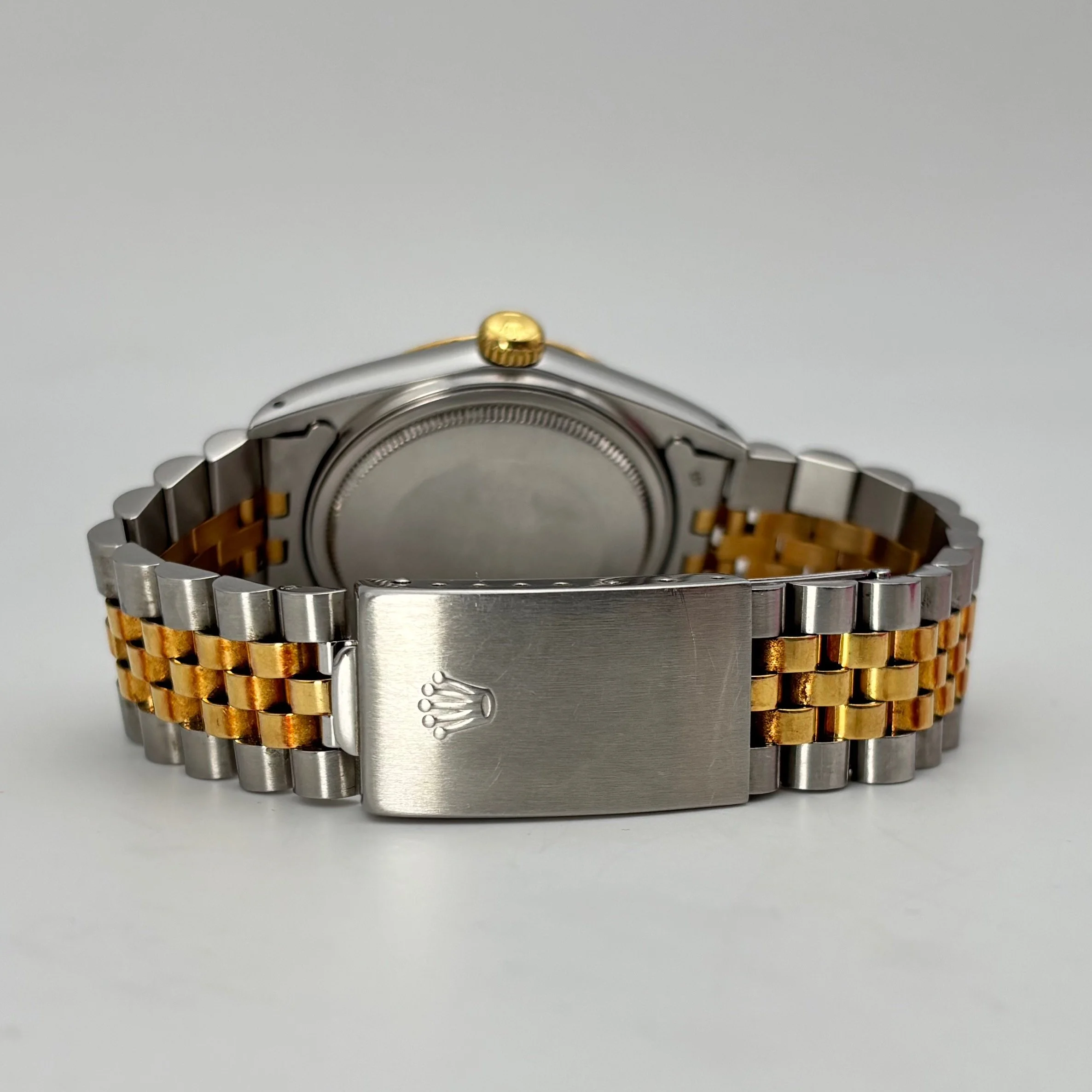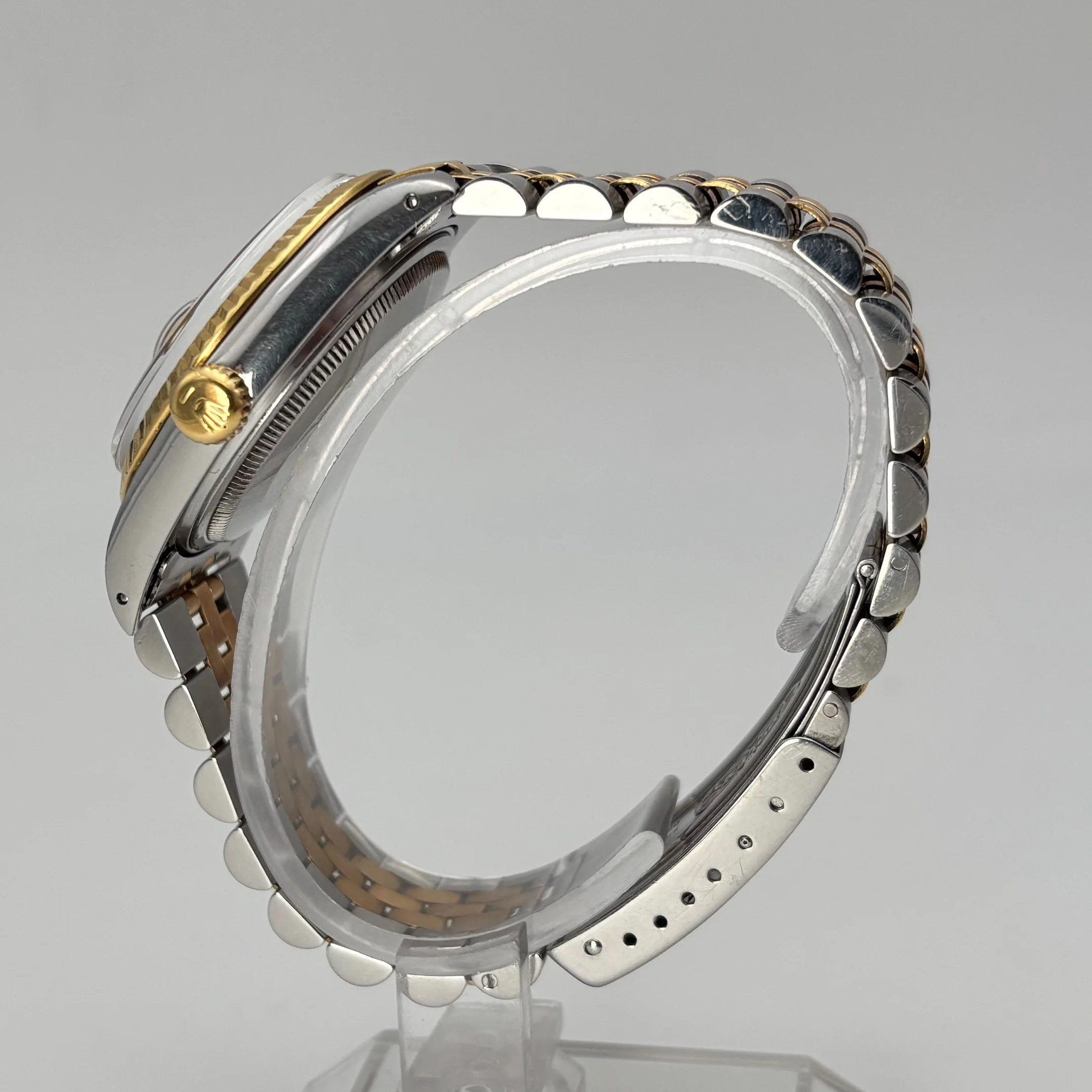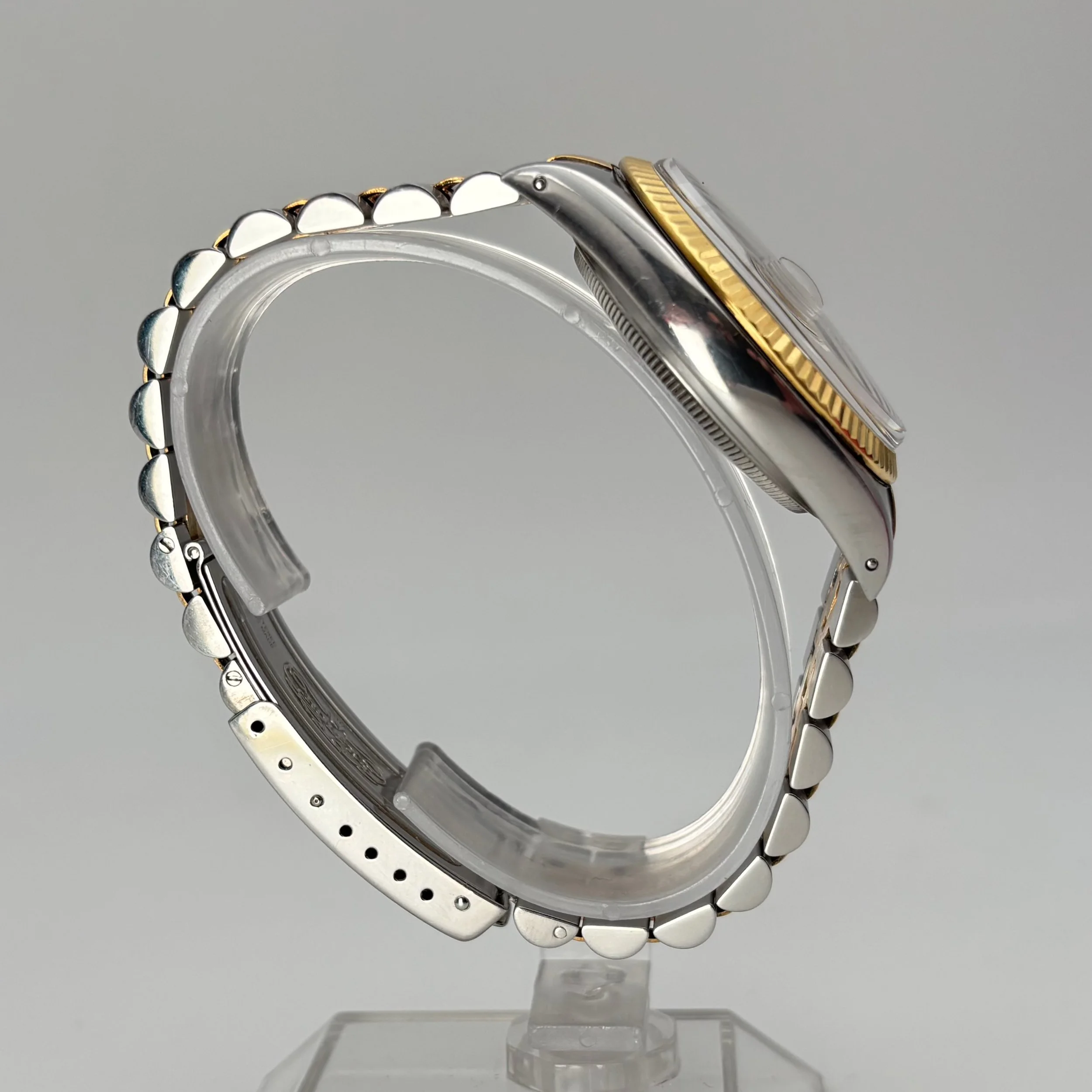 We are pleased to offer this classic Rolex Datejust 36, reference 16013 — a timeless model that embodies the elegance, versatility, and reliability the Datejust line is renowned for. This piece carries a 9.6 million serial number, dating it to approximately 1987, and features a 36mm stainless steel case paired with an 18k yellow gold fluted bezel, surrounding a champagne “stick” dial with matching gold hands and black-filled indices with white lume plots. The watch is powered by the automatic Rolex Caliber 3035 movement. It is fitted on a two-tone Rolex Jubilee bracelet with four removable screws, minimal stretch, and will comfortably fit up to a 6.75-inch wrist. The bracelet shows light patina on some of the gold center links, and the case and bracelet display superficial scratches consistent with age and wear. This watch comes complete with its original inner and outer boxes, papers dated October 1987, green hangtag, and red COSC chronometer hangtag.