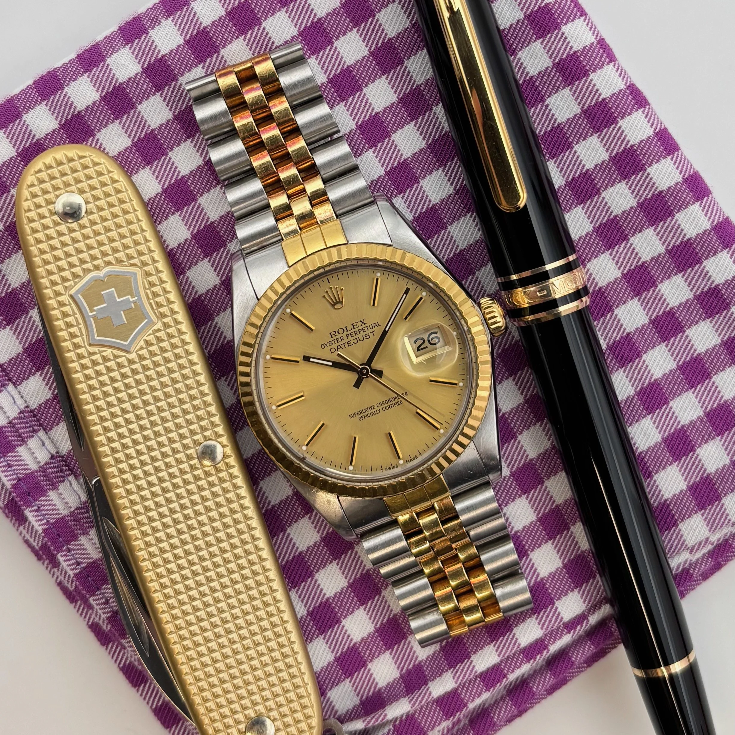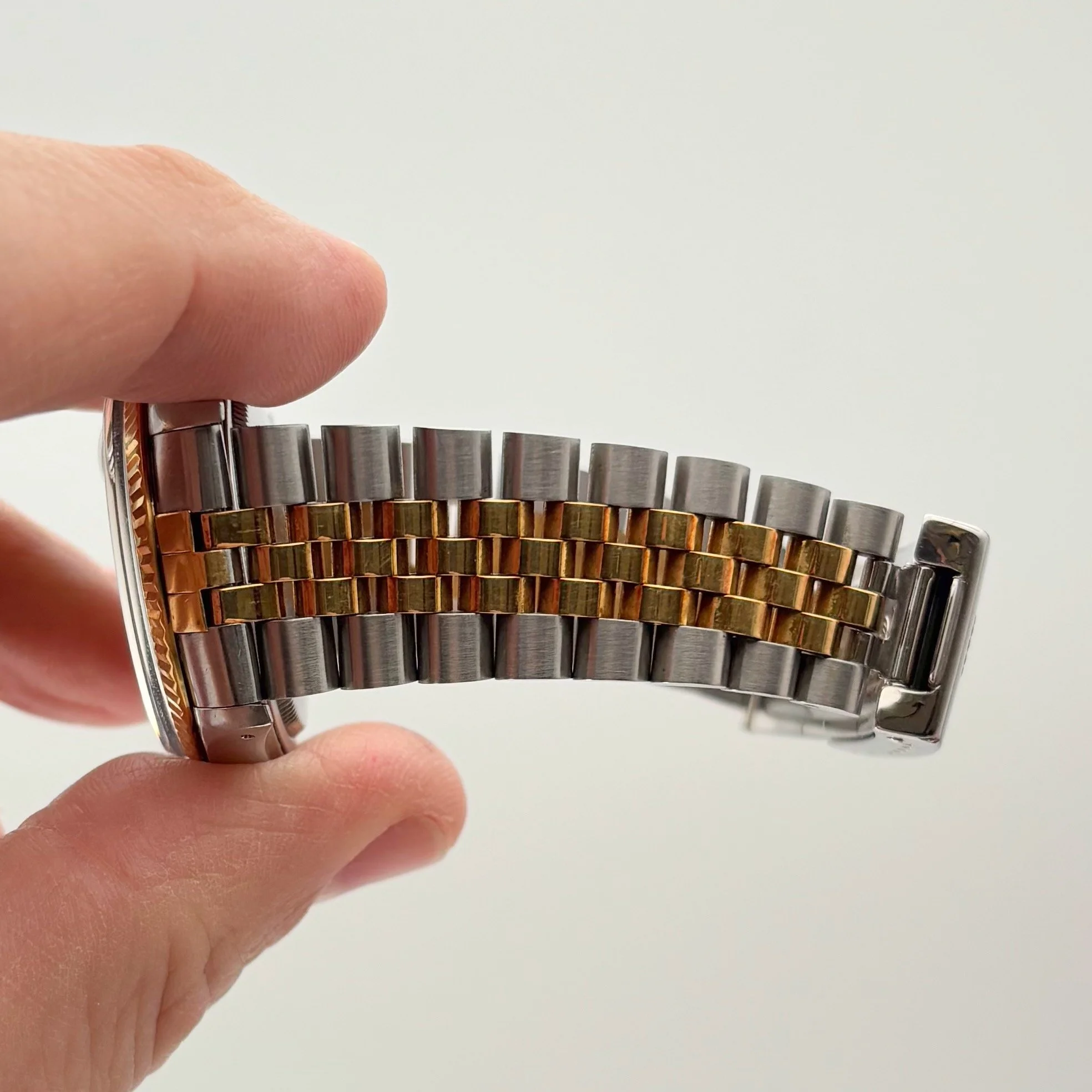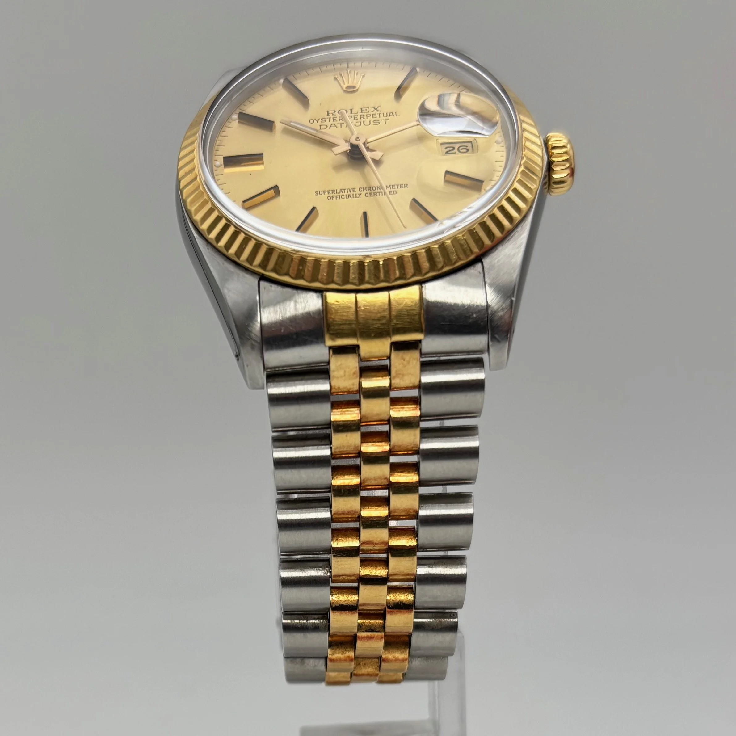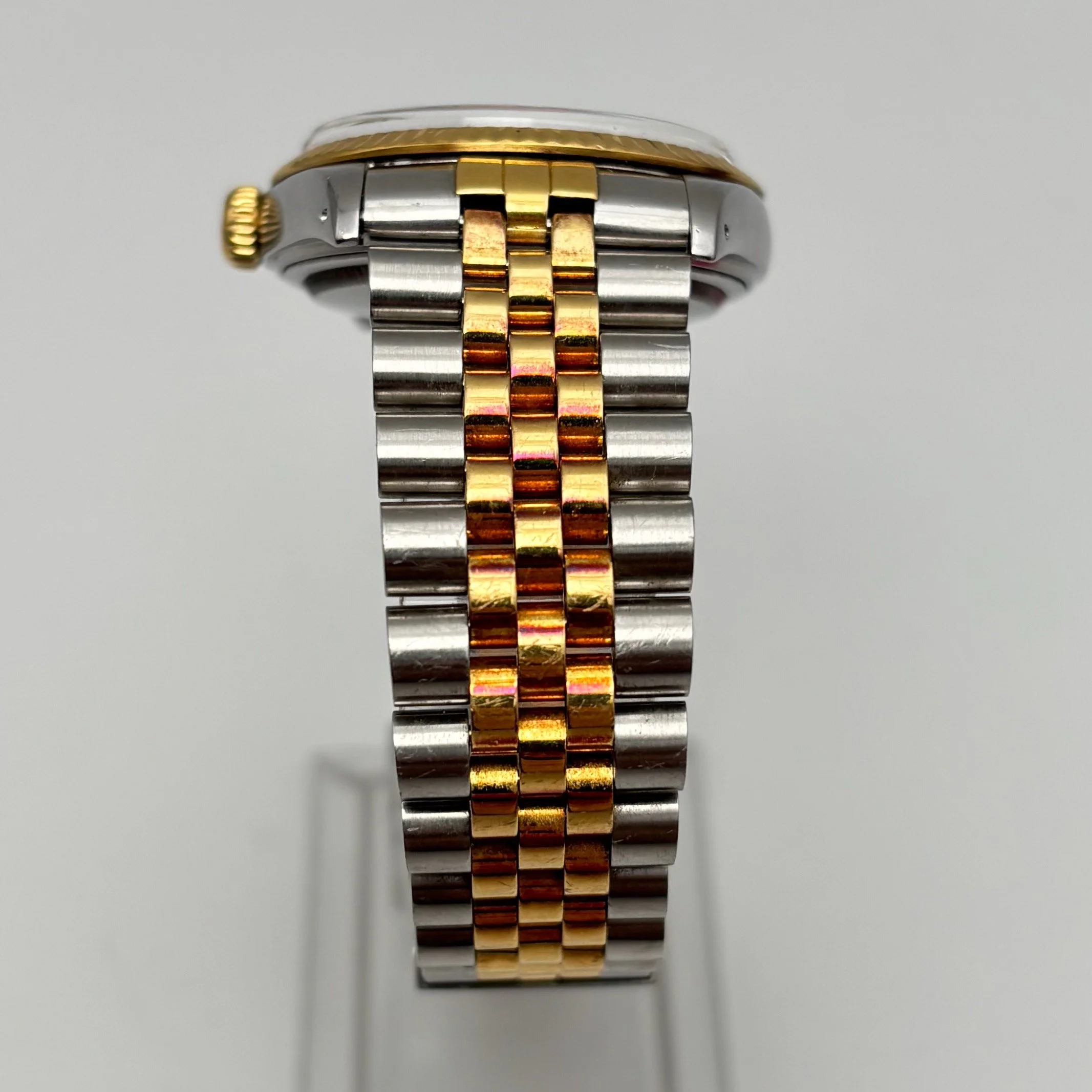 We are pleased to offer this classic Rolex Datejust 36, reference 16013 — a timeless model that embodies the elegance, versatility, and reliability the Datejust line is renowned for. This piece carries a 9.6 million serial number, dating it to approximately 1987, and features a 36mm stainless steel case paired with an 18k yellow gold fluted bezel, surrounding a champagne “stick” dial with matching gold hands and black-filled indices with white lume plots. The watch is powered by the automatic Rolex Caliber 3035 movement. It is fitted on a two-tone Rolex Jubilee bracelet with four removable screws, minimal stretch, and will comfortably fit up to a 6.75-inch wrist. The bracelet shows light patina on some of the gold center links, and the case and bracelet display superficial scratches consistent with age and wear. This watch comes complete with its original inner and outer boxes, papers dated October 1987, green hangtag, and red COSC chronometer hangtag.