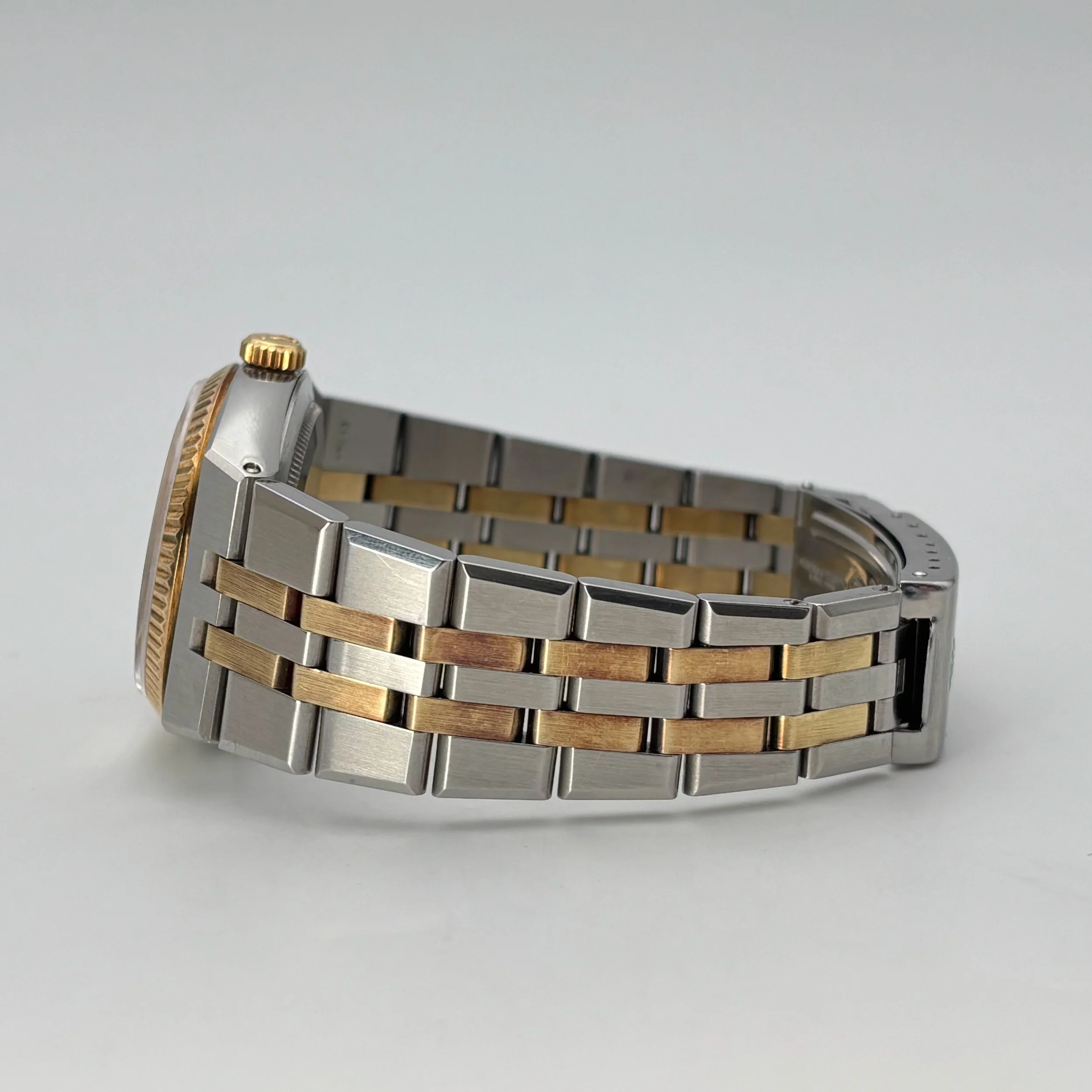 A true vintage icon with undeniable retro charm, this 1978 Rolex Oysterquartz Datejust 17013 MK1 captures the bold spirit of late-70s and early-80s luxury. Originally purchased in Brunei in January 1979 from The Borneo Company, this remarkable piece was later imported to Canada by the original owner, where it remained untouched in a safe for more than 25 years. Time has gracefully transformed the 18k gold, giving it a delicate purple hue — a rare oxidation seen only on well-preserved vintage examples.