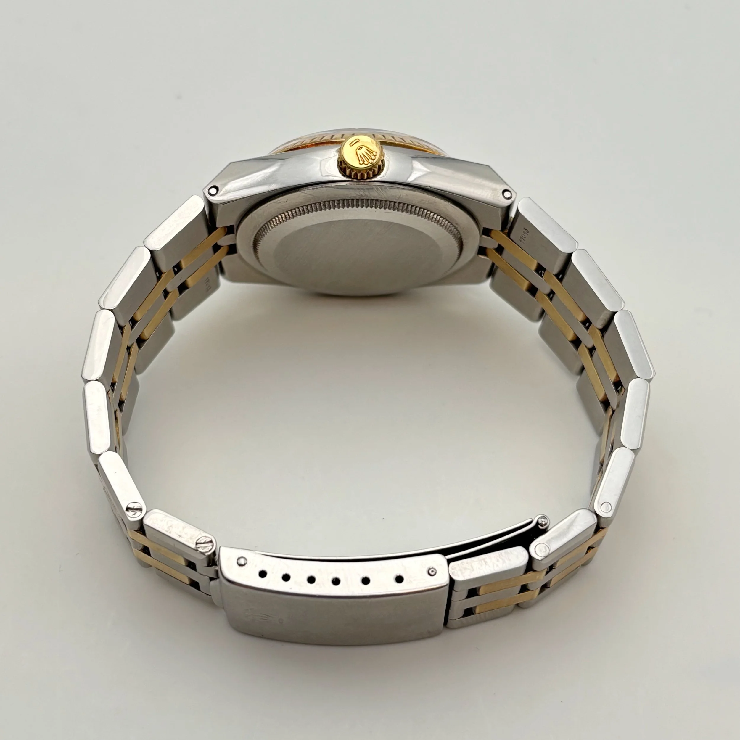 The case is attached to its original Oysterquartz Jubilee bracelet in 18k yellow gold and stainless steel, maintaining its signature two-tone elegance. Inside beats the Rolex Caliber 5035, a groundbreaking quartz movement developed in-house. Designed to meet Rolex’s high standards of precision and durability, this movement remains one of the finest examples of quartz innovation in luxury watchmaking. Produced for 25 years in limited numbers, the Oysterquartz line remains a rare and collectible part of Rolex history. The case and bracelet of this watch appear unpolished and remain in good condition, with the exception of superficial scratching throughout the case, bezel, and bracelet. Accompanying the watch is its original green Rolex box, green hangtag, translation papers, original receipt from The Borneo Company, and guarantee papers dated in January of 1979.