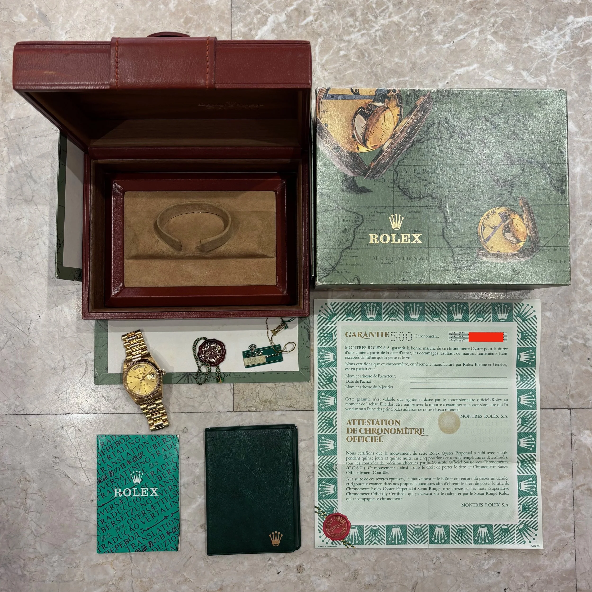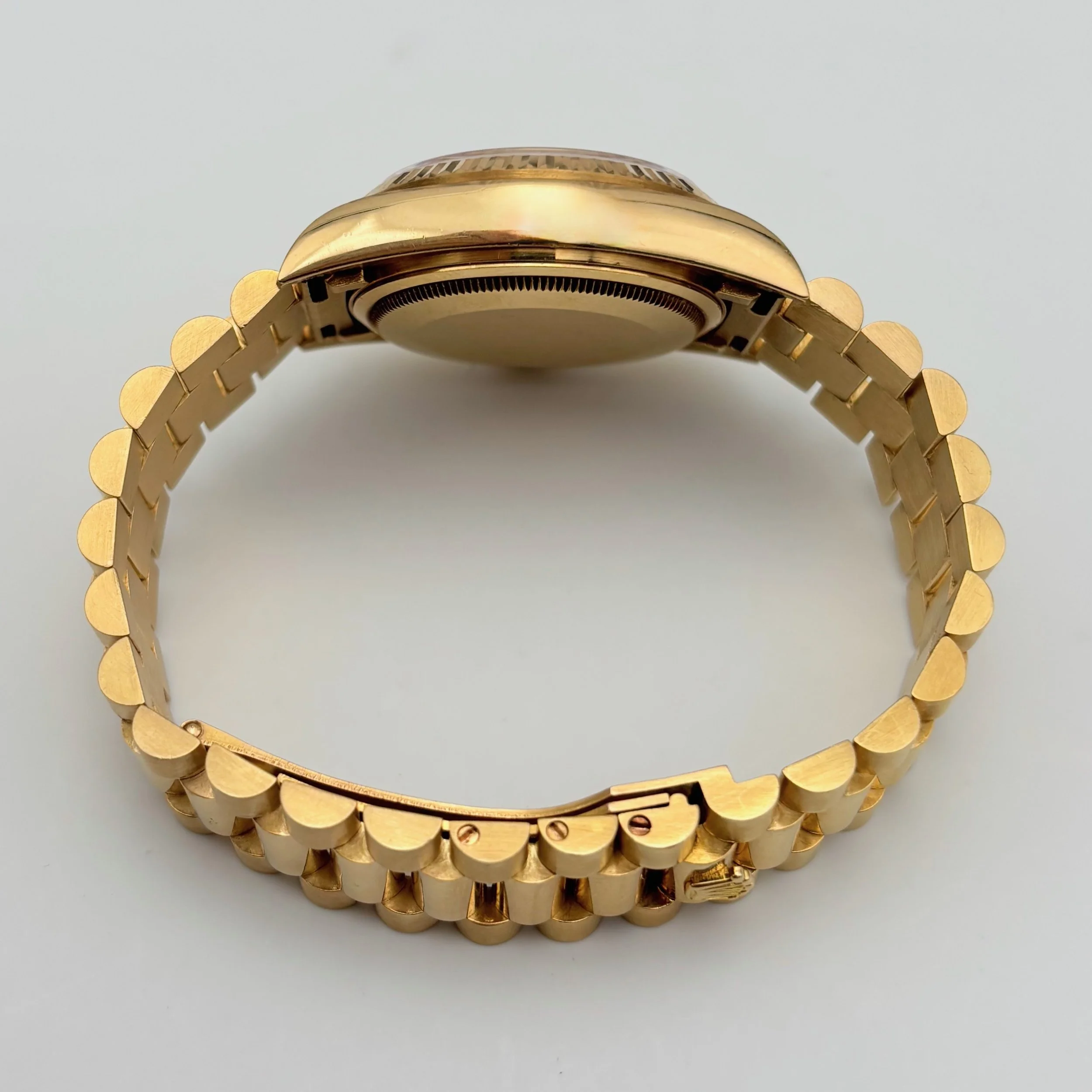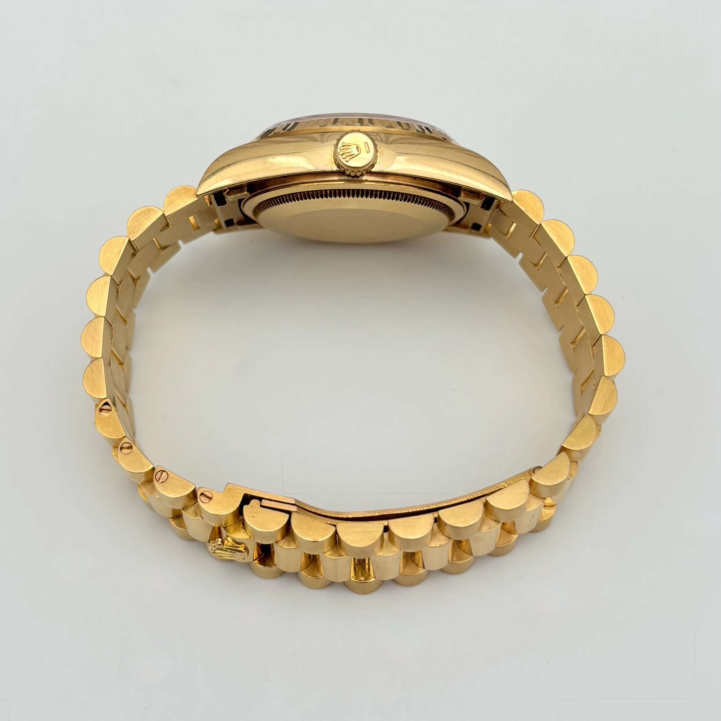 Bring home the gold with this exceptional 18k yellow gold Rolex Day-Date, reference 18038, featuring a 36mm case. With its 8.5 million serial number, this piece dates to 1984, showcasing a perfect blend of vintage charm and enduring prestige. The unpolished case, retaining its original chamfers and sharp lines, elegantly surrounds a perfect champagne dial adorned with baton indices. The case is attached to its original unpolished Rolex President bracelet, crafted in solid gold and fitted with seven screws. Overall, this timepiece remains in very good vintage condition, showing only superficial scratches and very minor dings throughout the case, bezel, and bracelet. The gold throughout the watch has a nice patina and the bracelet has moderate stretch. Accompanying the watch is its original inner display box, outer box, translation pamphlet, green leather booklet holder, red chronometer hangtag, green hangtag, and the original guarantee papers with an open date.
