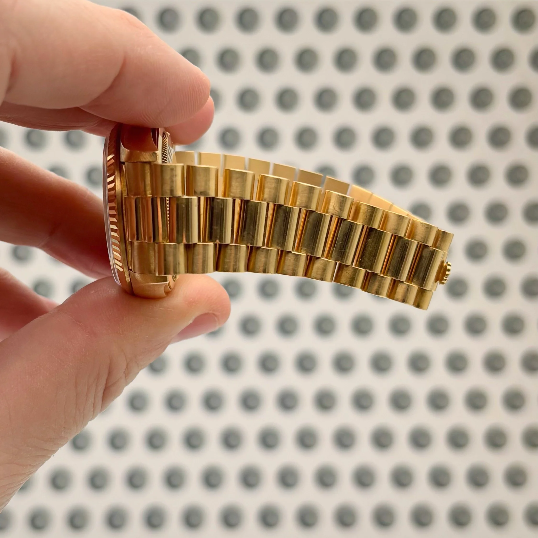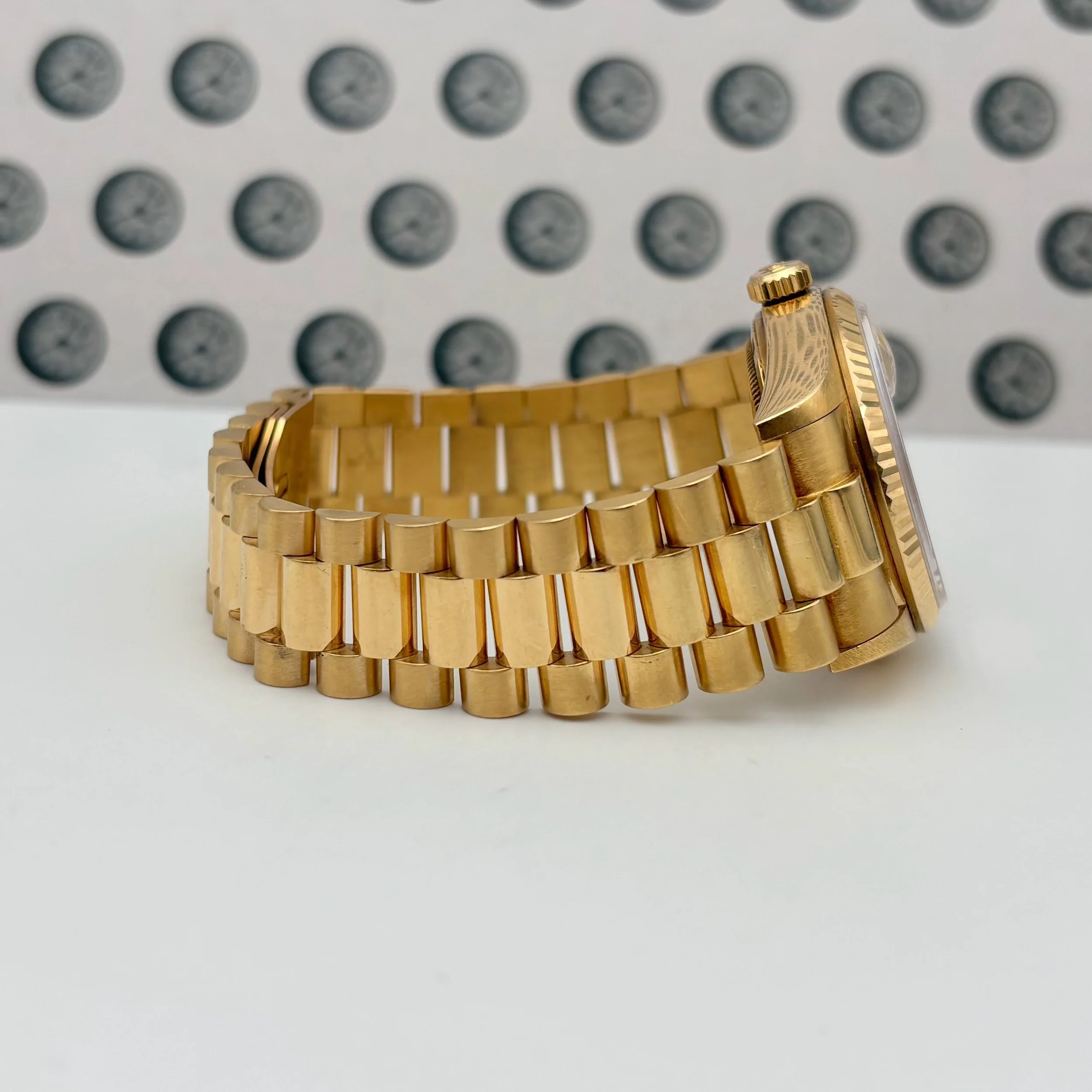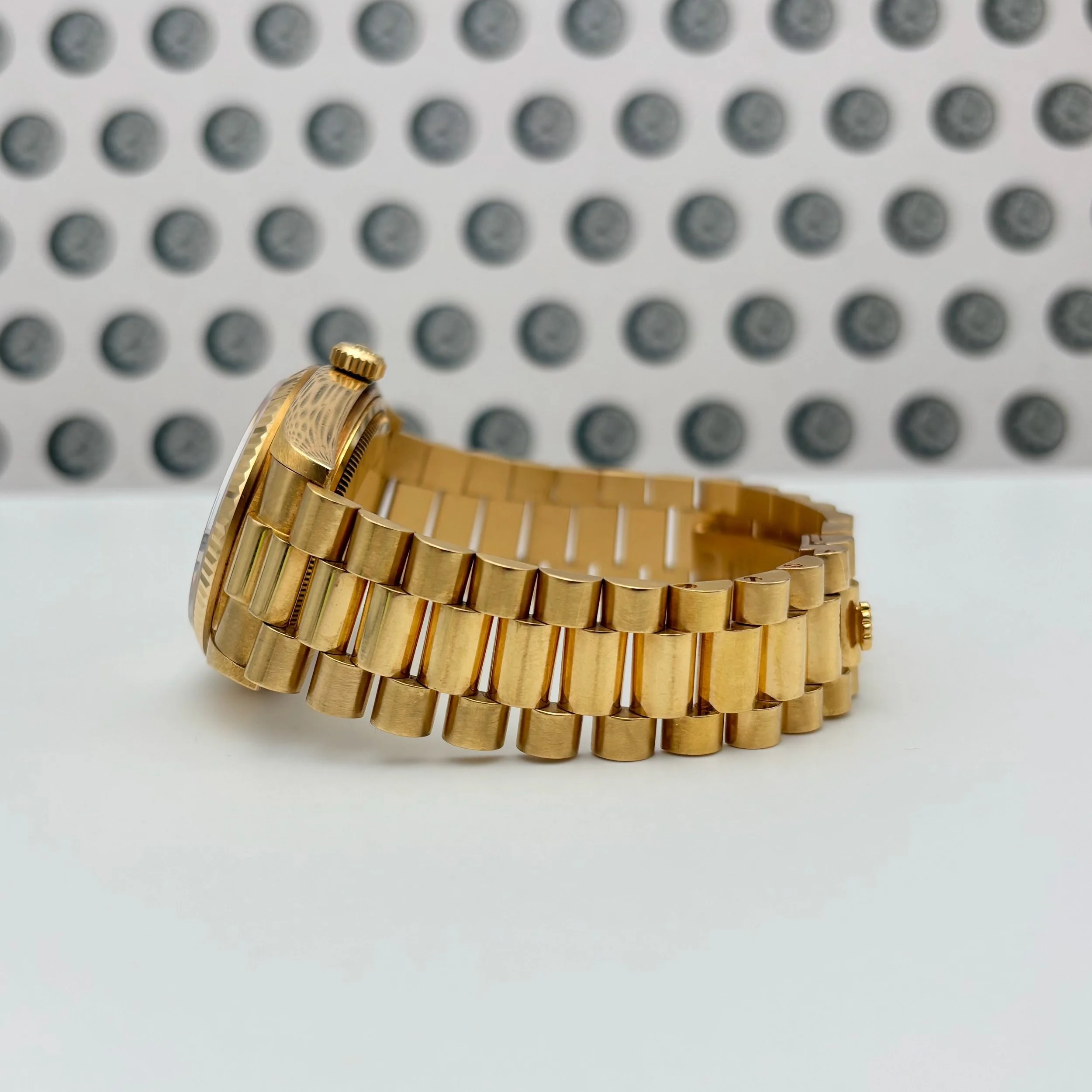 Bring home the gold with this exceptional 18k yellow gold Rolex Day-Date, reference 18038, featuring a 36mm case. With its 8.5 million serial number, this piece dates to 1984, showcasing a perfect blend of vintage charm and enduring prestige. The unpolished case, retaining its original chamfers and sharp lines, elegantly surrounds a perfect champagne dial adorned with baton indices. The case is attached to its original unpolished Rolex President bracelet, crafted in solid gold and fitted with seven screws. Overall, this timepiece remains in very good vintage condition, showing only superficial scratches and very minor dings throughout the case, bezel, and bracelet. The gold throughout the watch has a nice patina and the bracelet has moderate stretch. Accompanying the watch is its original inner display box, outer box, translation pamphlet, green leather booklet holder, red chronometer hangtag, green hangtag, and the original guarantee papers with an open date.