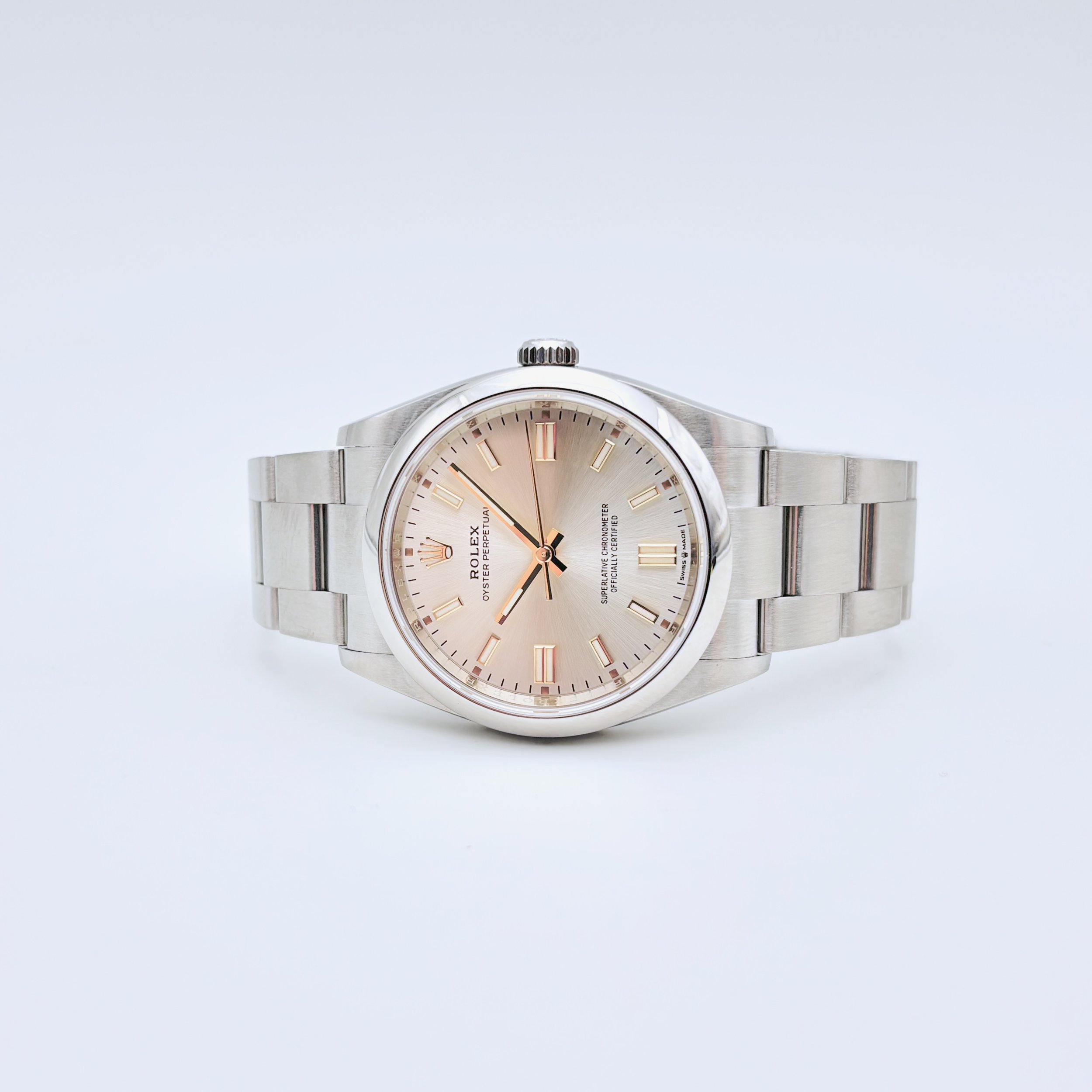 We are pleased to offer this preowned 2021 Rolex Oyster Perpetual 36, reference 126000, featuring a classic silver dial. The watch is housed in a 36mm Oystersteel case and powered by the in-house Rolex Calibre 3230 automatic movement, providing approximately 70 hours of power reserve. Movement functions include center hour, minute, and seconds hands, along with stop-seconds for precise time setting. Fitted to the case is a Rolex Oyster bracelet with full links and a folding Oysterclasp buckle equipped with the Easylink 5 mm comfort extension. The condition of this timepiece is excellent, free of any scratches. This watch will ship complete with the outer box, green inner display box, white serialized hang tag, leather card wallet, Worldwide Service Warranty Booklet, Oyster Perpetual booklet, and Rolex International Guarantee Card dated January 2021.