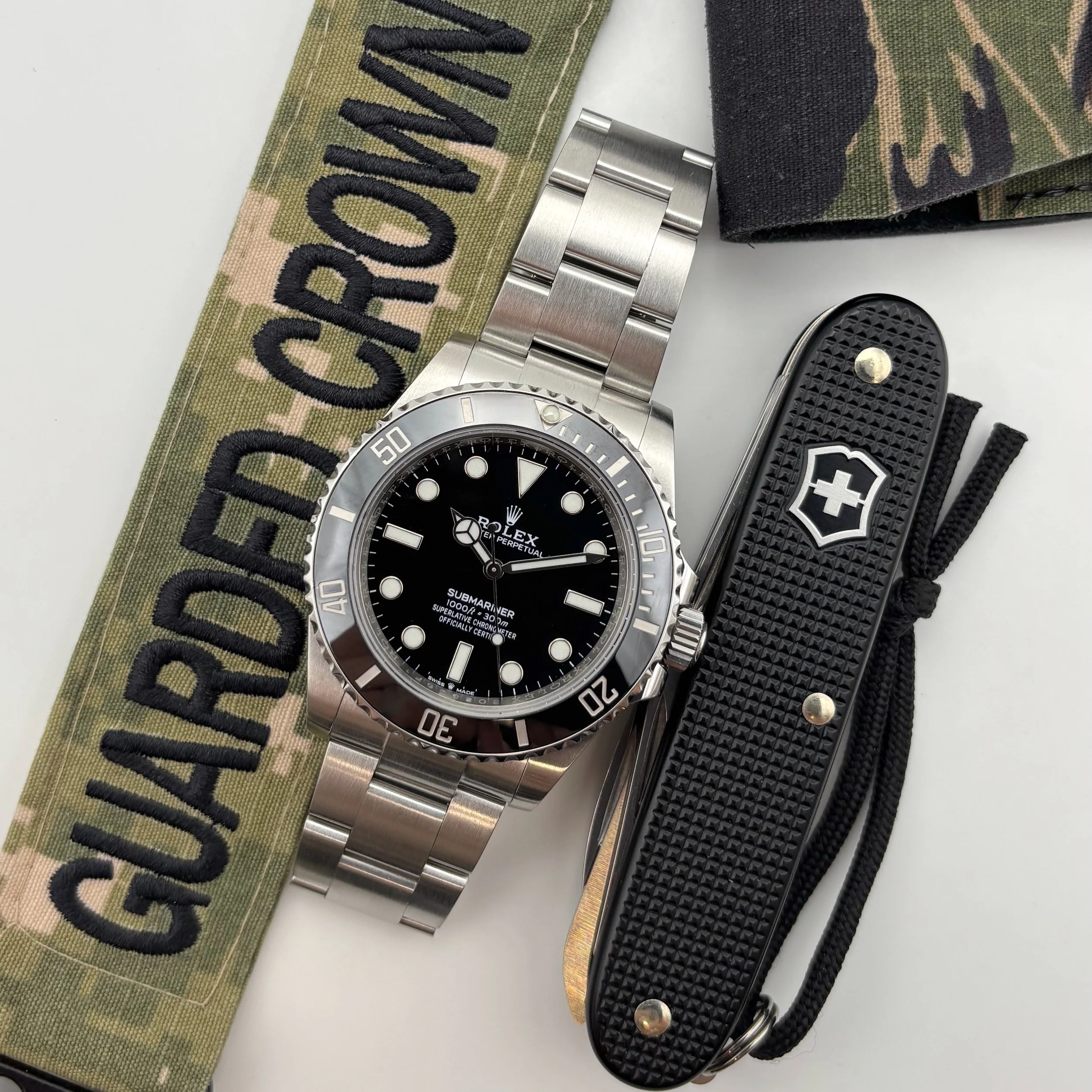 Dive into the depths with this preowned 2020 Rolex Submariner 124060—an icon built for precision beneath the surface. This timepiece has the 41mm stainless steel case surrounding a black dial with Chromalight blue lume on the indices and handset. The watch has a black Cerachrom bezel insert on a stainless steel Oyster bracelet with full links, a folding buckle, and Glidelock extension, allowing for expansion of the band by approximately 20mm in precise 2mm increments. Functions include hours, minutes, seconds and a countdown unidirectional bezel. This piece comes as a complete set, with all accessories pictured. Recently serviced in April 2026 and offered as a complete set, it stands as a true embodiment of Rolex’s legendary dive watch heritage.