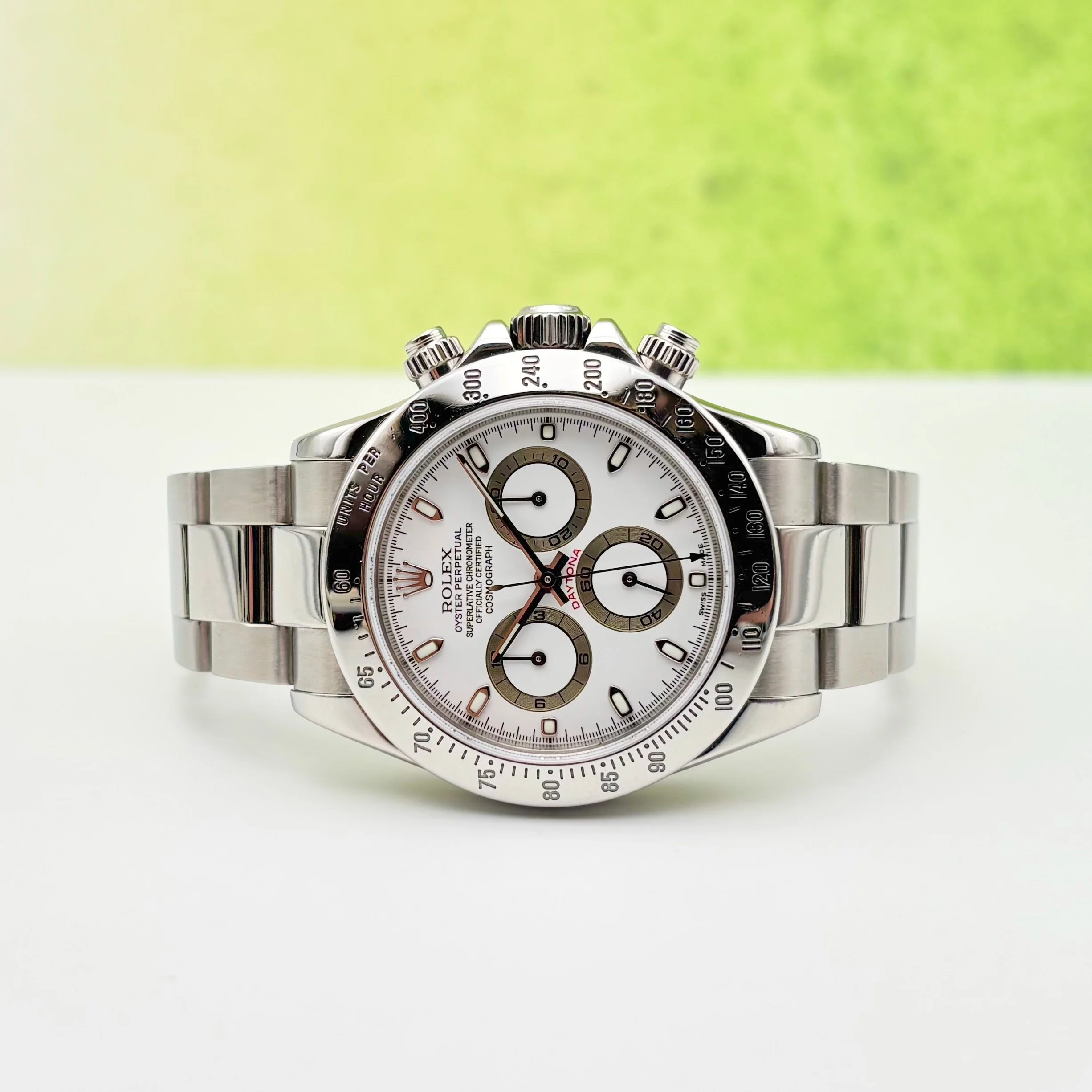 A true icon of motorsport heritage, this white dial Rolex Daytona Ref. 116520 represents one of the most celebrated eras of the model’s evolution. Bearing an F serial, this example dates production to approximately 2003 and showcases the perfect balance of modern engineering and classic Daytona design.
