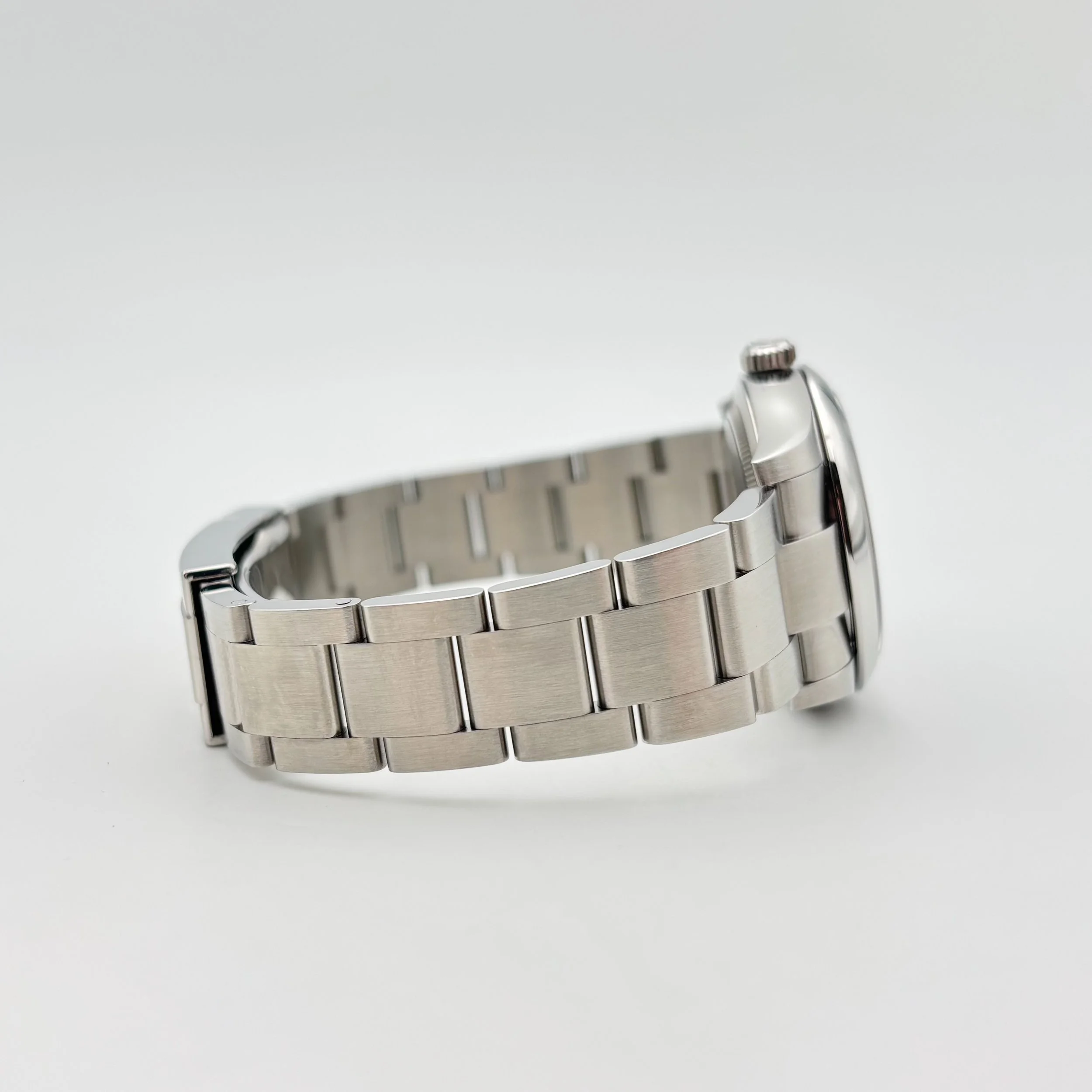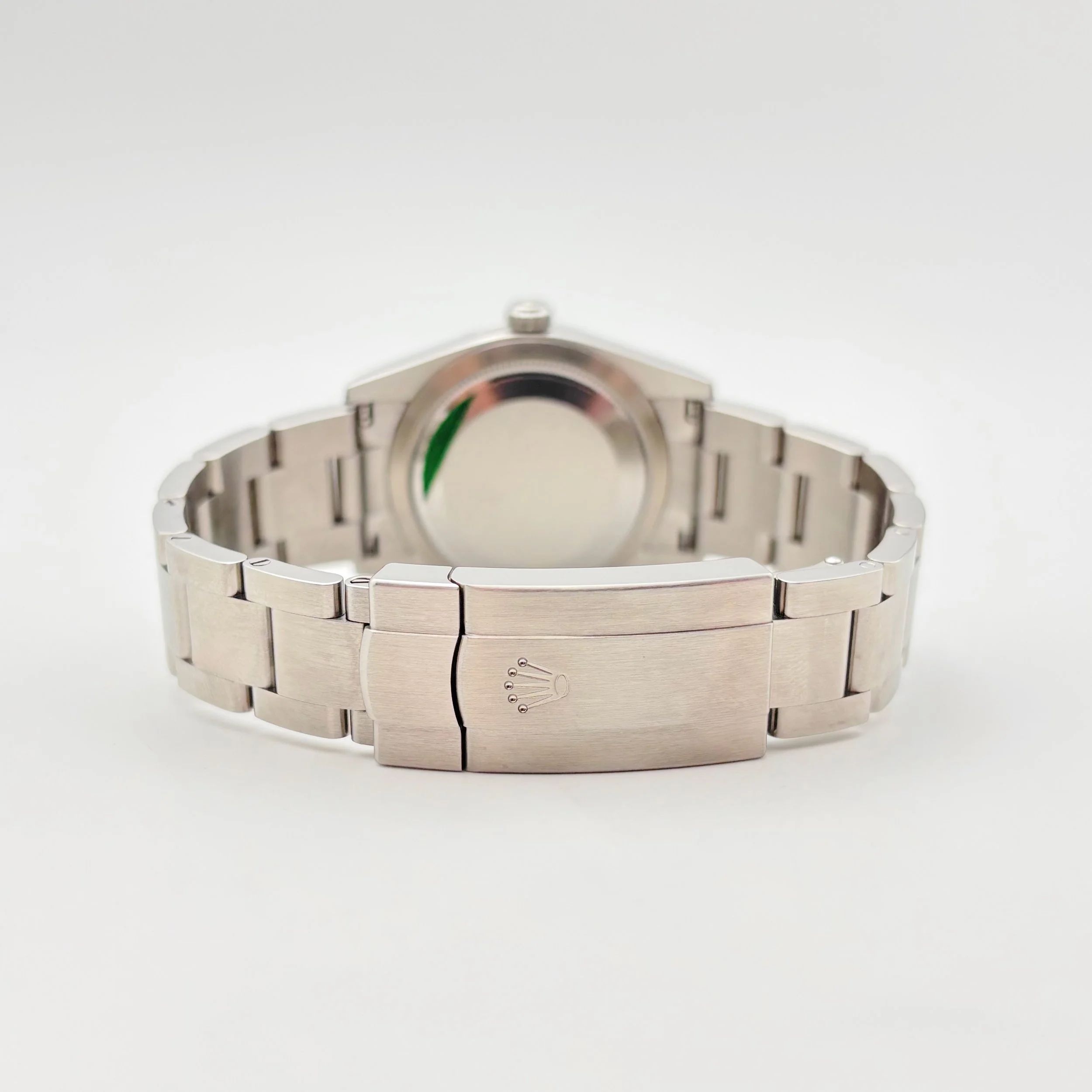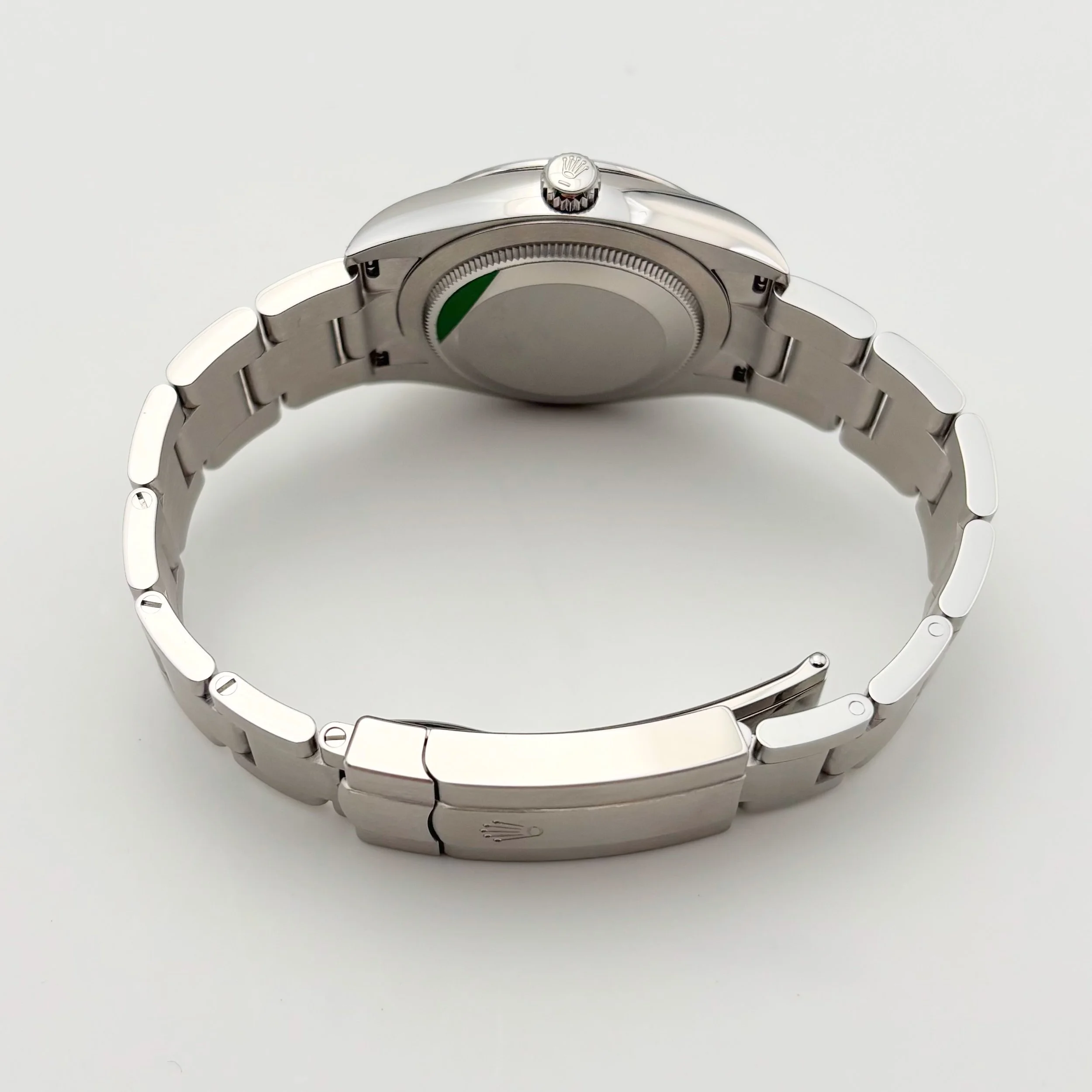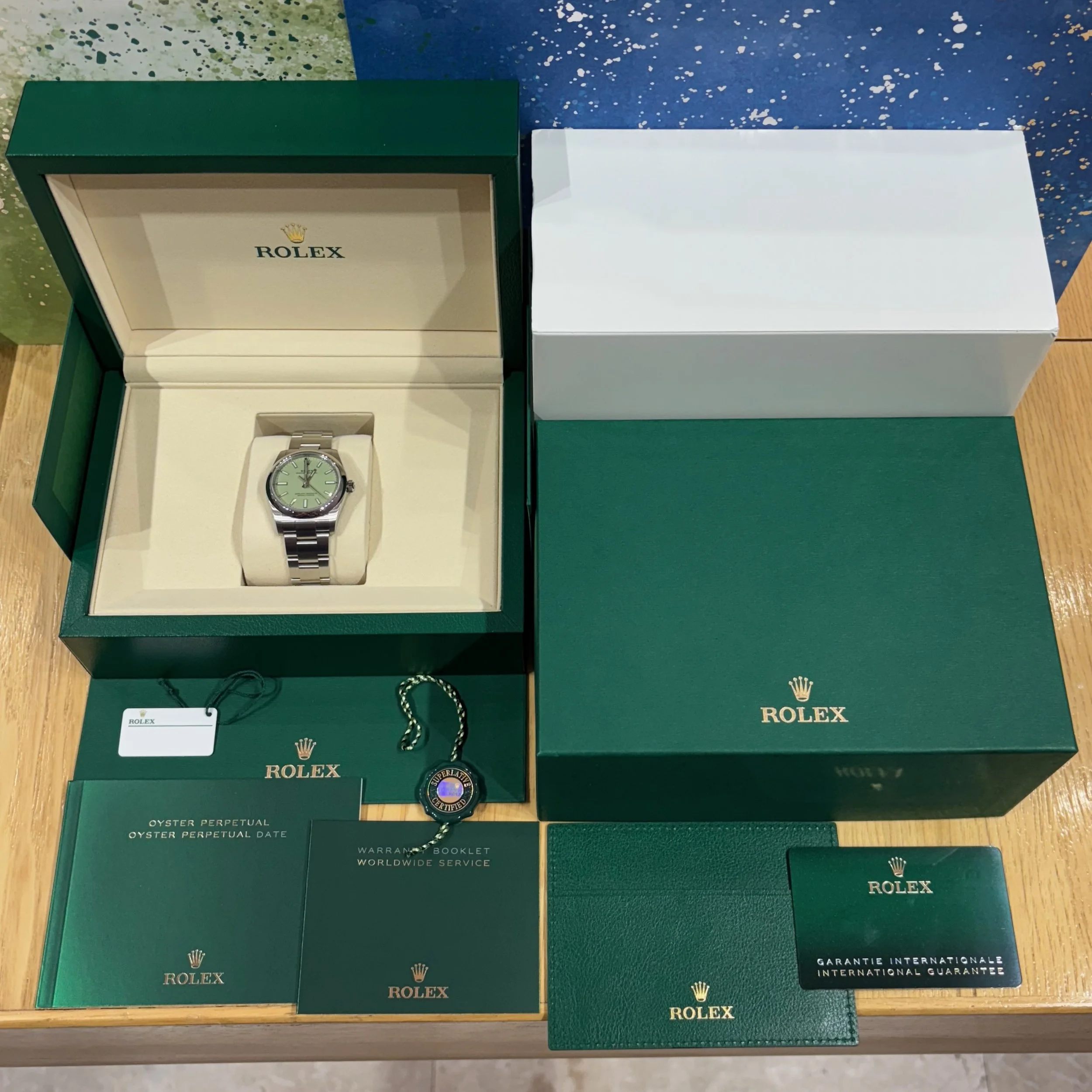 We are pleased to offer this unworn 2025 Rolex Oyster Perpetual 34, with reference 124200, featuring a pistachio dial— a new dial variant released by Rolex in 2025. This watch has a 34mm Oystersteel case and is powered by the in-house Rolex Calibre 2232 automatic movement, offering approximately 55 hours of power reserve. Movement functions include center hour, minute, and seconds hands, along with stop-seconds for precise time setting. Attached to the case is a Rolex Oyster bracelet with full links and a folding Oysterclasp buckle for a secure and comfortable fit. The watch will ship with the outer box, green inner display box, green chronometer certification hang tag, white serialized hang tag, leather card wallet, Worldwide Service Warranty Booklet, Oyster Perpetual booklet, and Rolex International Guarantee Card dated in November 2025.