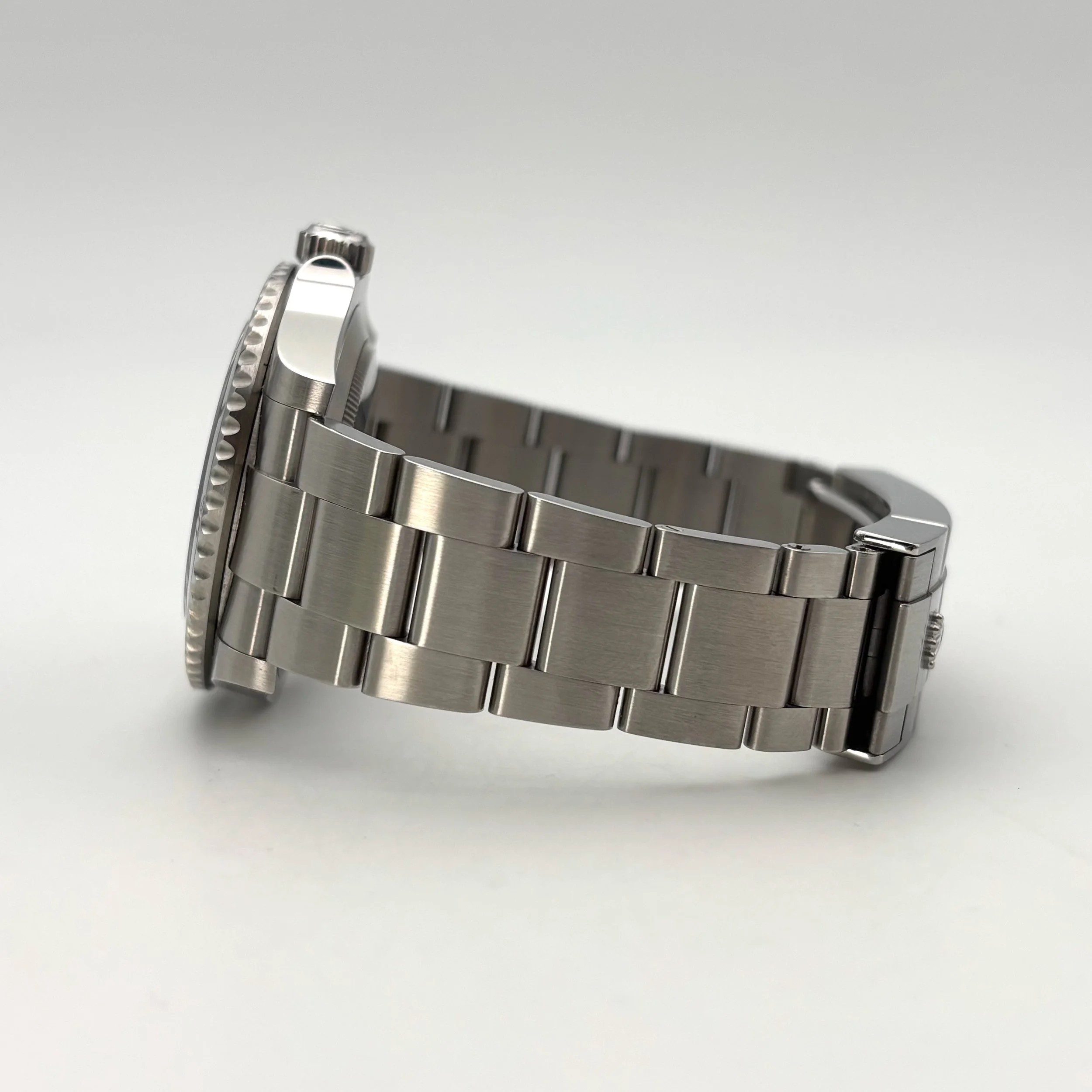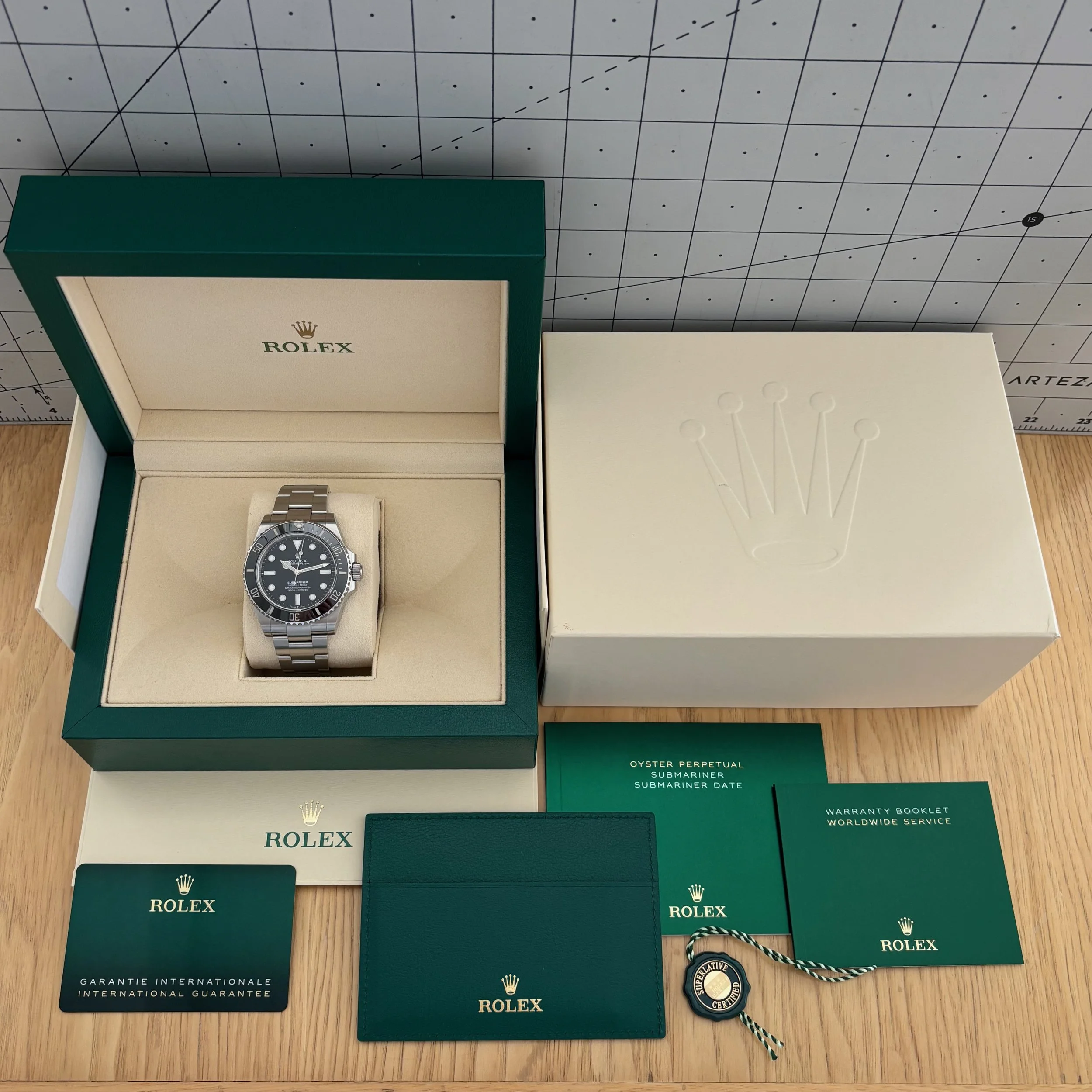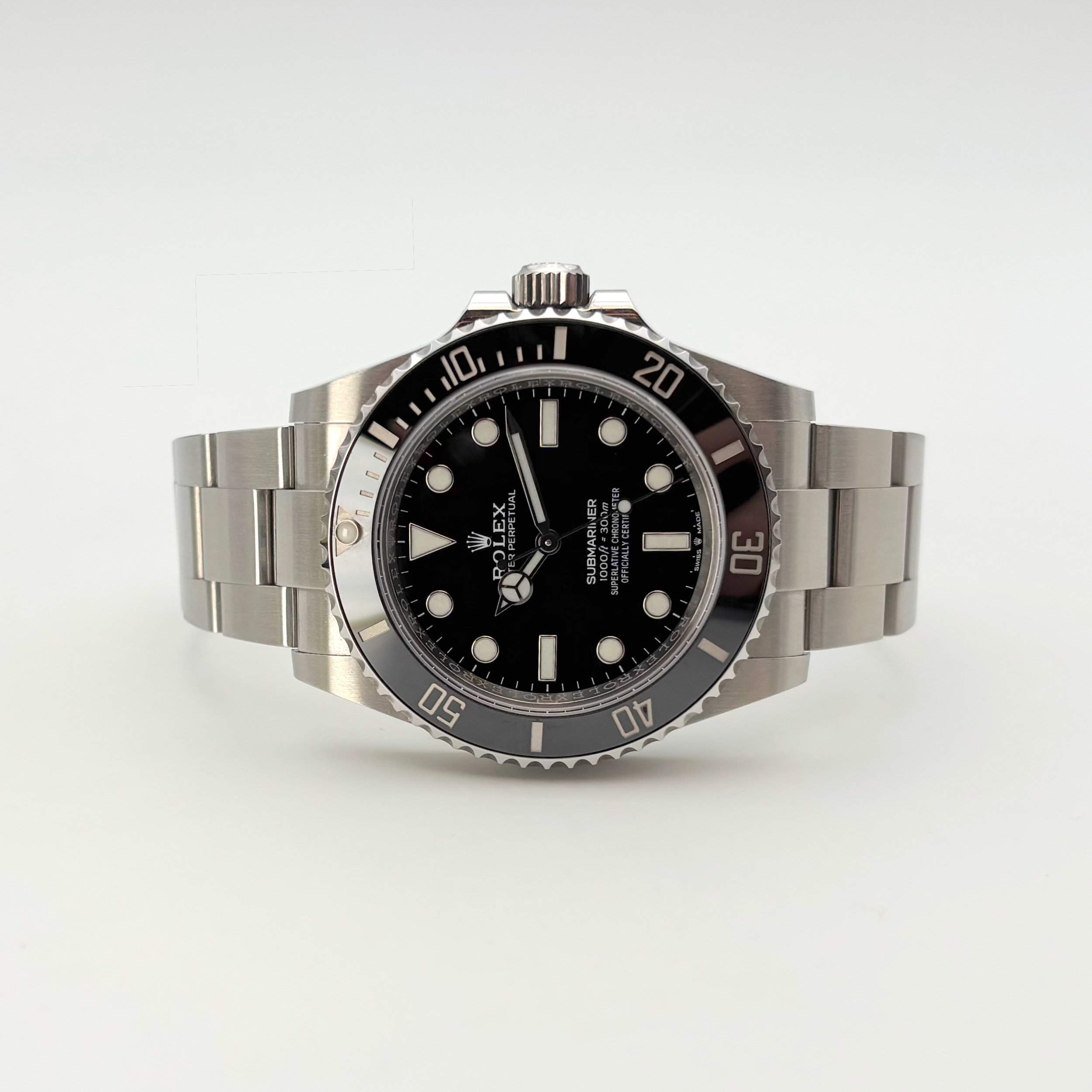 We are pleased to offer this preowned, unpolished, Rolex Submariner 41 No Date, with the reference 124060. This timepiece has the 41mm stainless steel case surrounding a black dial and black bezel insert on a stainless steel Oyster bracelet with folding buckle. Functions include hours, minutes, seconds and countdown unidirectional bezel. The condition of this timepiece is very good, with the exception of very minor superficial scratching on the case and bracelet. This watch comes complete with its original inner display box, outer box, Worldwide Service booklet, Submariner manual, Rolex International Warranty card (dated March 2021), green hang tag, and leather booklet sleeve.