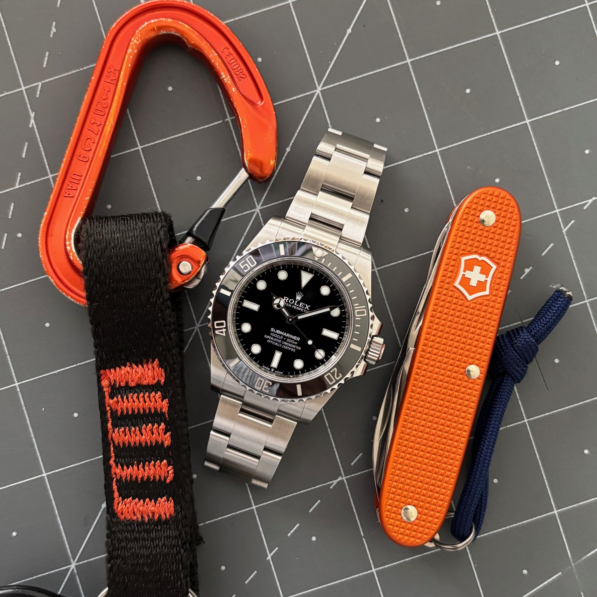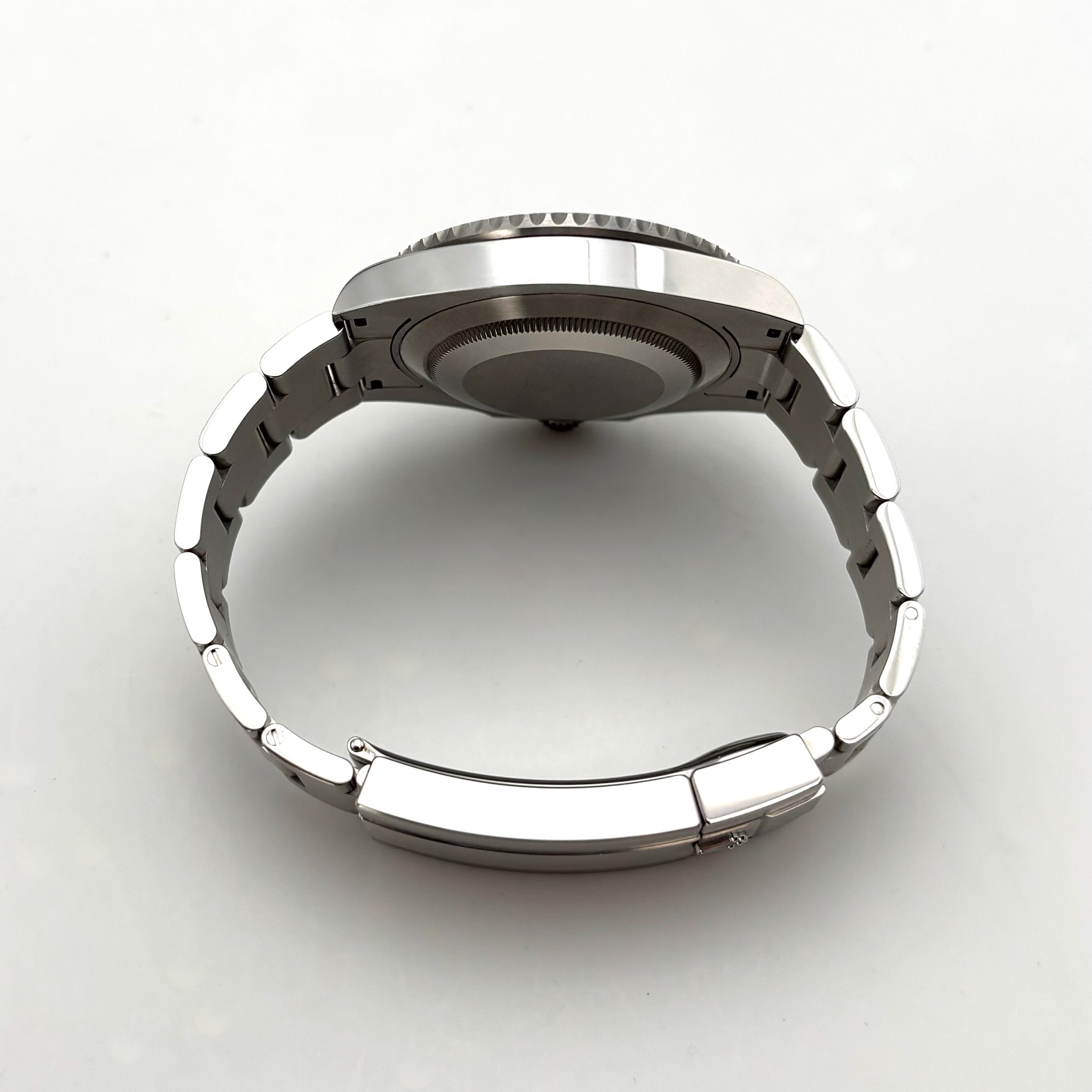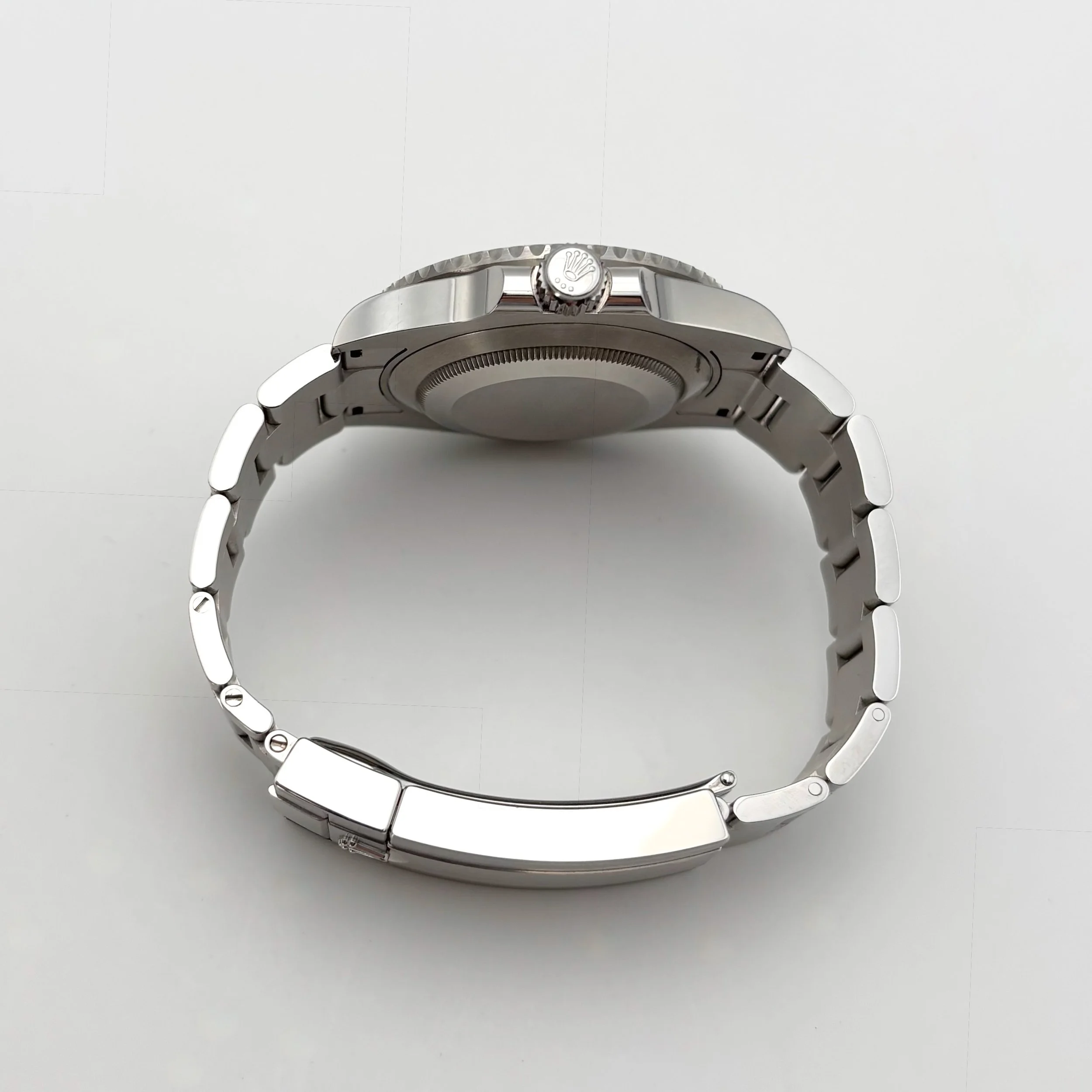 We are pleased to offer this preowned, unpolished, Rolex Submariner 41 No Date, with the reference 124060. This timepiece has the 41mm stainless steel case surrounding a black dial and black bezel insert on a stainless steel Oyster bracelet with folding buckle. Functions include hours, minutes, seconds and countdown unidirectional bezel. The condition of this timepiece is very good, with the exception of very minor superficial scratching on the case and bracelet. This watch comes complete with its original inner display box, outer box, Worldwide Service booklet, Submariner manual, Rolex International Warranty card (dated March 2021), green hang tag, and leather booklet sleeve.