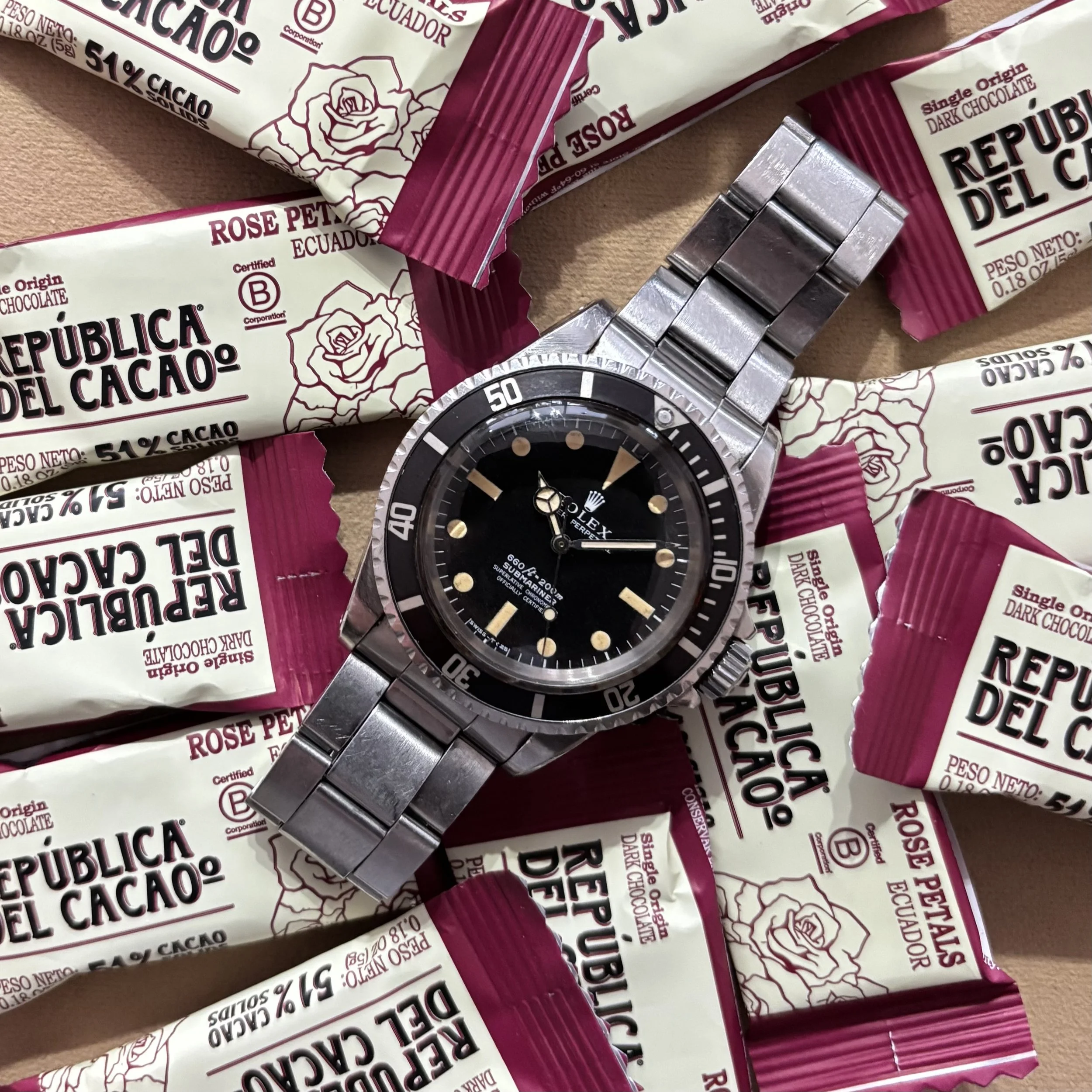 The watch is currently fitted with 285 end links and an original Rolex 9315 folded-link Oyster bracelet with 11 links, stamped with an “A” date code, dating production to 1976. The bracelet shows superficial scratching throughout, but retains a crisp and well-defined coronet on the clasp. The case has been previously polished and shows superficial scratching and a few minor dings. There is a faint engraving on the caseback of the watch reading “R.E.N.”. This piece is accompanied by its original outer box, inner box, bezel booklet, vinyl papers holder, anchor, Chronometer guide, “punched” Chronometer papers, “punched” and dealer stamped Guarantee papers/booklet that is dated in October of 1972.