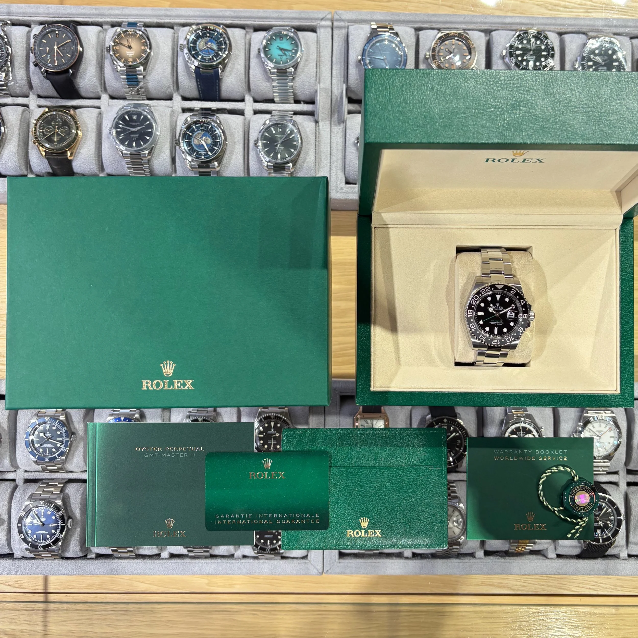 When Bruce Wayne flies private - and he always flies private - this preowned Rolex GMT-Master II, would be on his wrist as he steps onto his jet. This reference 126710GRNR-003 has a 40mm stainless steel case and rotating bezel surrounding a black dial and black/gray Cerachrom bezel insert on a stainless steel jubilee bracelet with a folding Oysterlock safety clasp with Easylink 5mm comfort extension link. Functions include hours, minutes, seconds and 24-hour bidirectional GMT bezel. This watch is accompanied by a full set including its original inner box, outer Rolex box, warranty booklet, GMT-Master II booklet, green chronometer certification hangtag, green leather card holder, and international guarantee warranty card, dated in February 2025.
