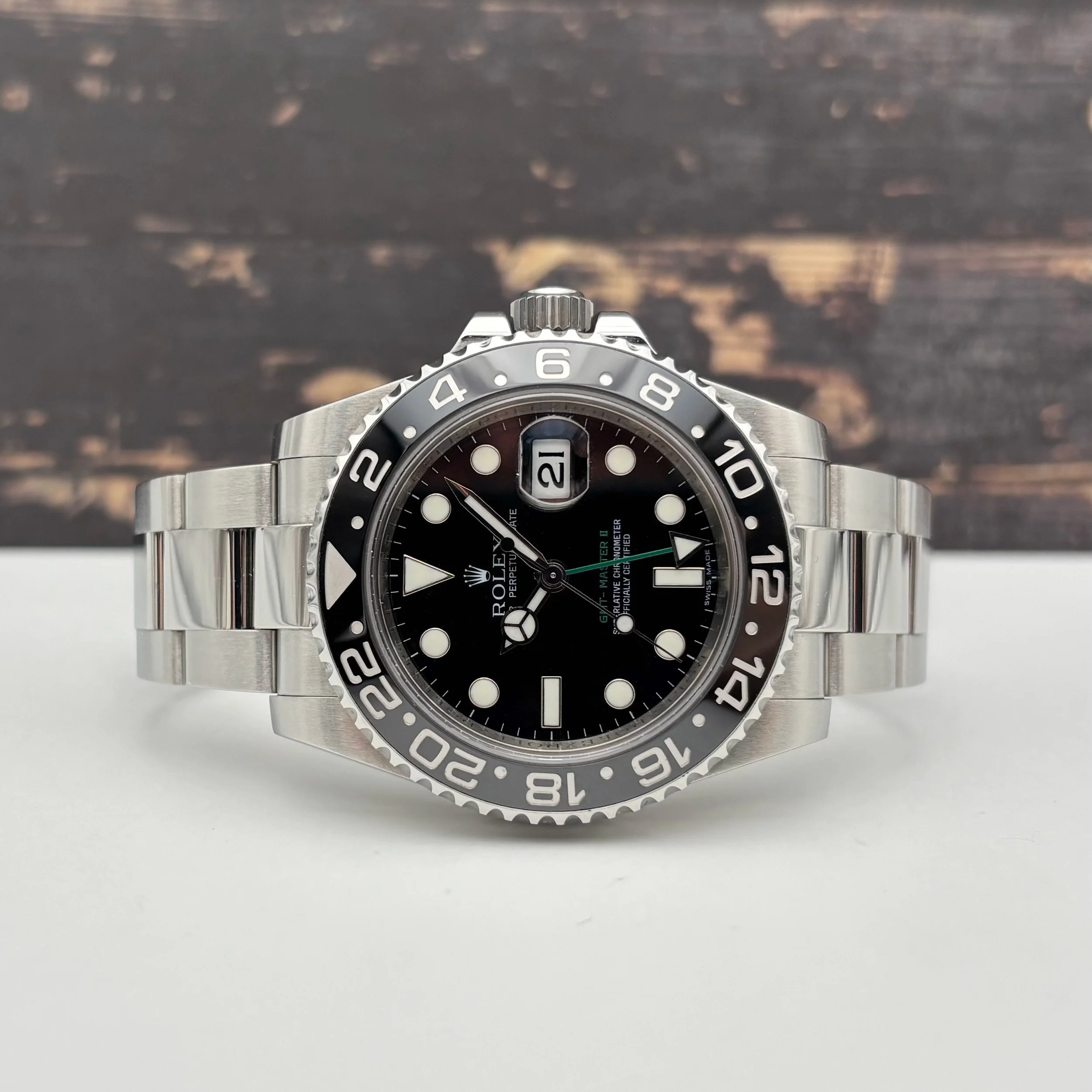 Take flight with the sharpest watch on the plane. This gorgeous, preowned stainless steel Rolex GMT-Master II has reference 116710LN. This timepiece has the stainless steel 40mm case with a black ceramic bidirectional rotating 24 hour bezel surrounding a black dial with a Super-Luminova display and a green GMT hand. The bracelet is a stainless steel Rolex Oyster bracelet with an oysterclasp that has an easy link extension and 11 links. This timepiece is in good condition, with the exception of superficial scratching throughout the case and bracelet. Accompanying this watch is its Rolex International Guarantee card, dated February 2011, leather card wallet, outer Rolex box, inner Rolex display box, red chronometer certification hangtag, and Rolex GMT-Master II booklet.