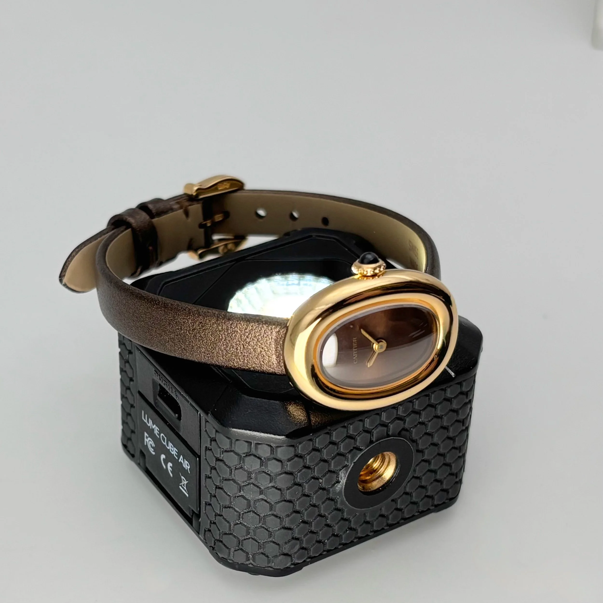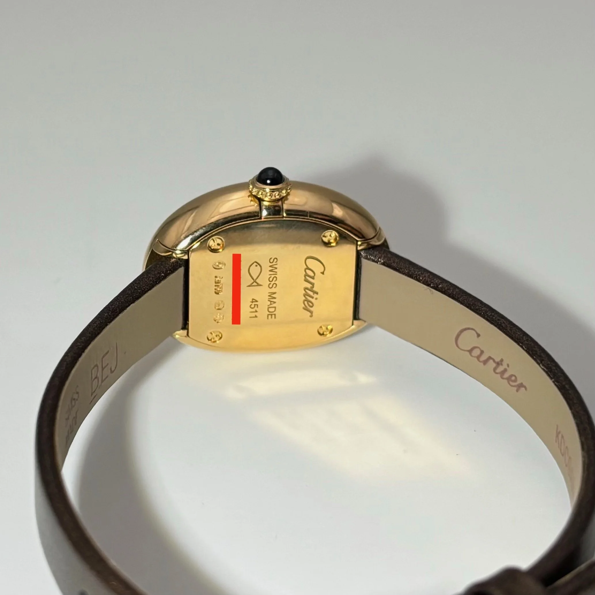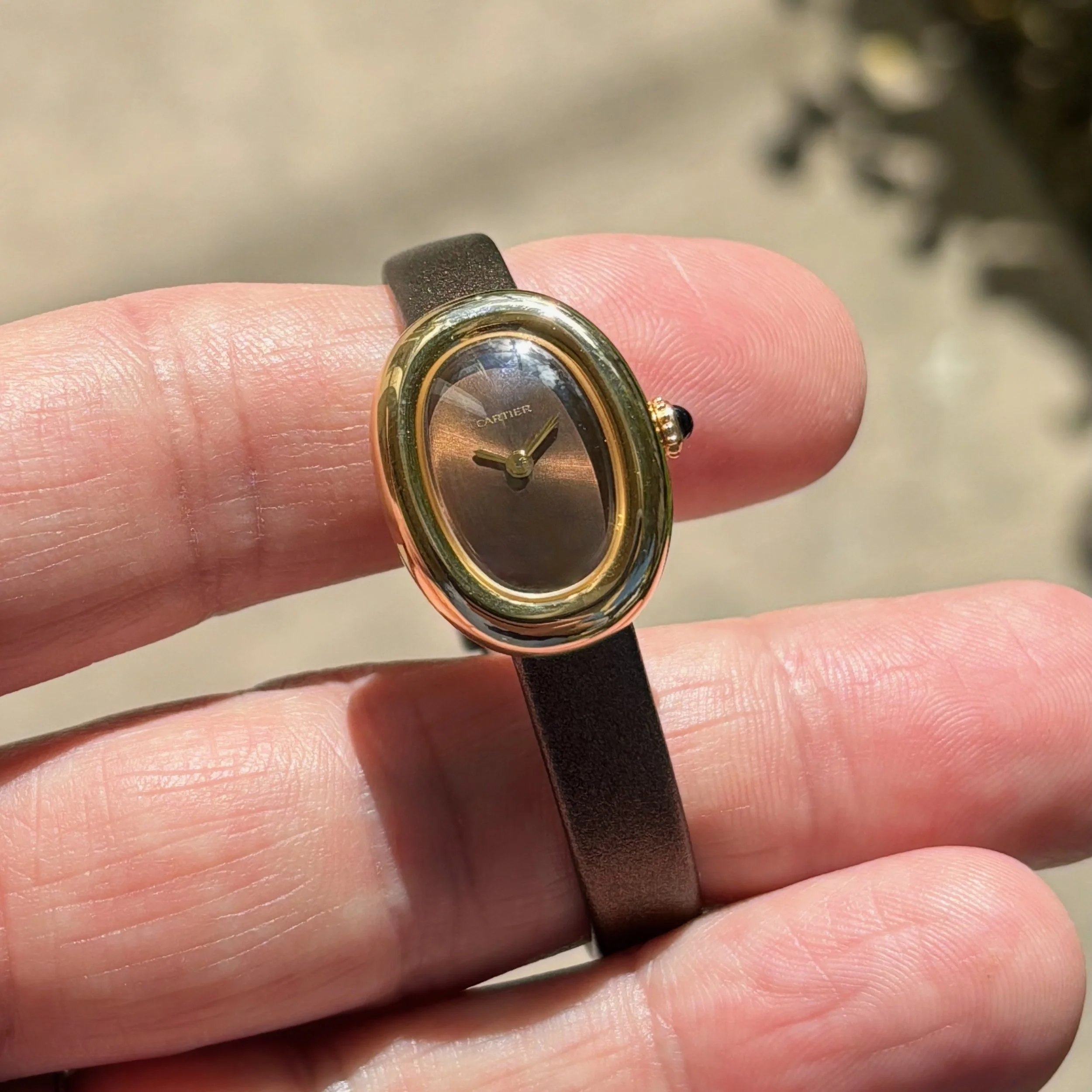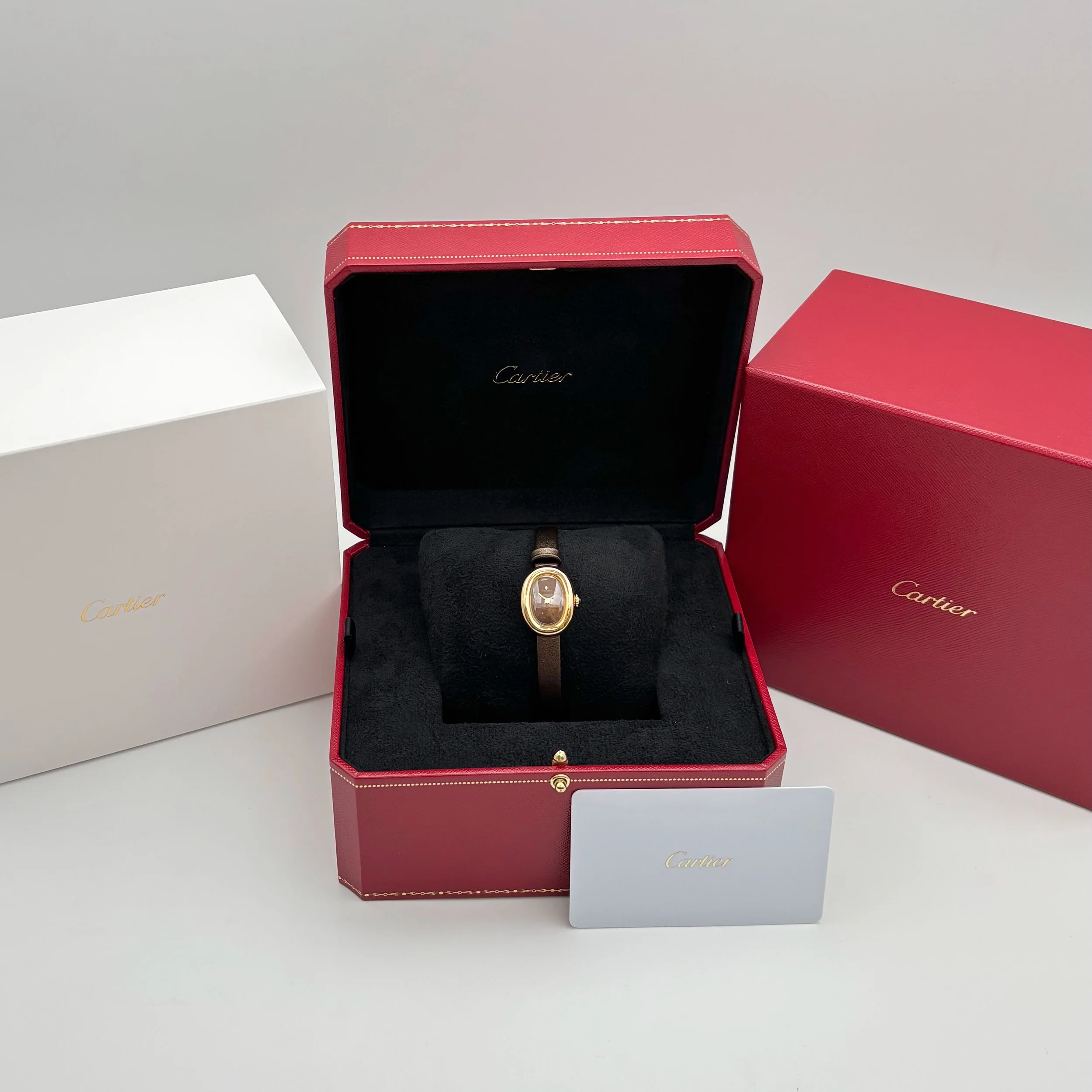 Elegant and effortlessly timeless, this 2025 Cartier Baignoire showcases the maison’s mastery of refined design and craftsmanship. Inspired by the iconic 1912 design that first defined the “Baignoire” collection, its graceful ellipse-shaped case embodies Cartier’s signature harmony of purity and sophistication. The watch features a 24.6 x 18.7 mm 18K yellow gold case with a beaded crown set with a sapphire cabochon, housing a bronze lacquered dial and golden-finish steel sword-shaped hands beneath a sapphire crystal. Powered by a precise quartz movement, it is paired with a bronze satin-finish calfskin leather strap secured by an 18K yellow gold ardillon buckle. With a slim 7.2 mm profile and water resistance up to 30 meters, this Baignoire Mini is the embodiment of Cartier’s timeless elegance—an exquisite addition to any sophisticated collection. The condition of this timepiece is good, with the exception of superficial scratching on the case and strap buckle. Purchased in April 2025, this piece comes as a complete set with its original inner box, outer box, red card holder and warranty card.