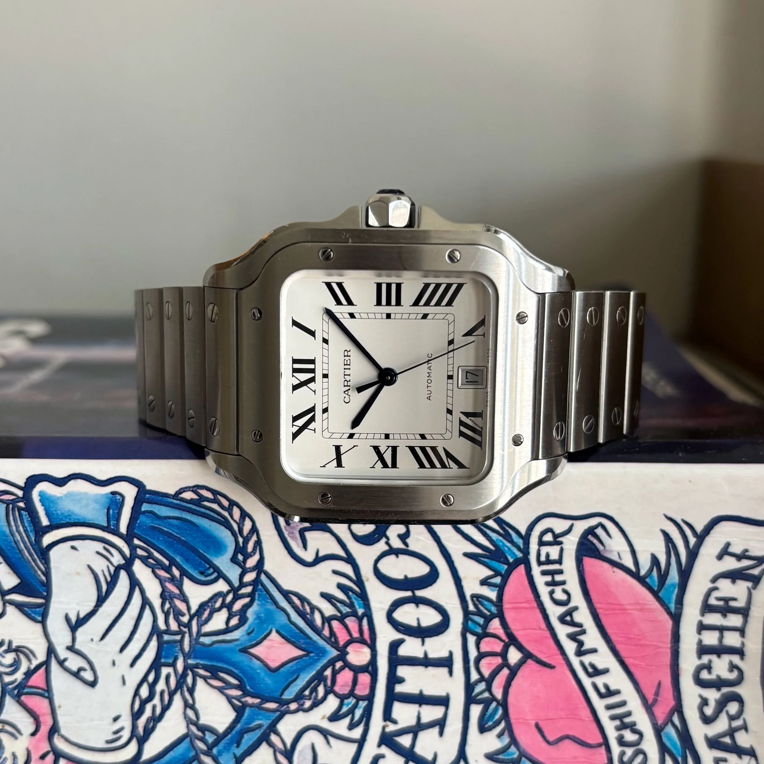 Powered by the Cartier Caliber 1847 MC automatic movement, the watch offers a 72-hour power reserve and is housed within a slim 9.38mm profile, balancing refined proportions with everyday wearability and timeless design. The timepiece is fitted on a stainless steel bracelet equipped with Cartier’s SmartLink adjustment system and is accompanied by an additional calfskin strap. Both are integrated with the QuickSwitch system, allowing for seamless and tool-free interchangeability. The watch is in good overall condition, showing superficial surface wear consistent with careful use. The bezel has been professionally finished to a brushed finish, presenting a distinct and intentional aesthetic departure from its original factory polish.