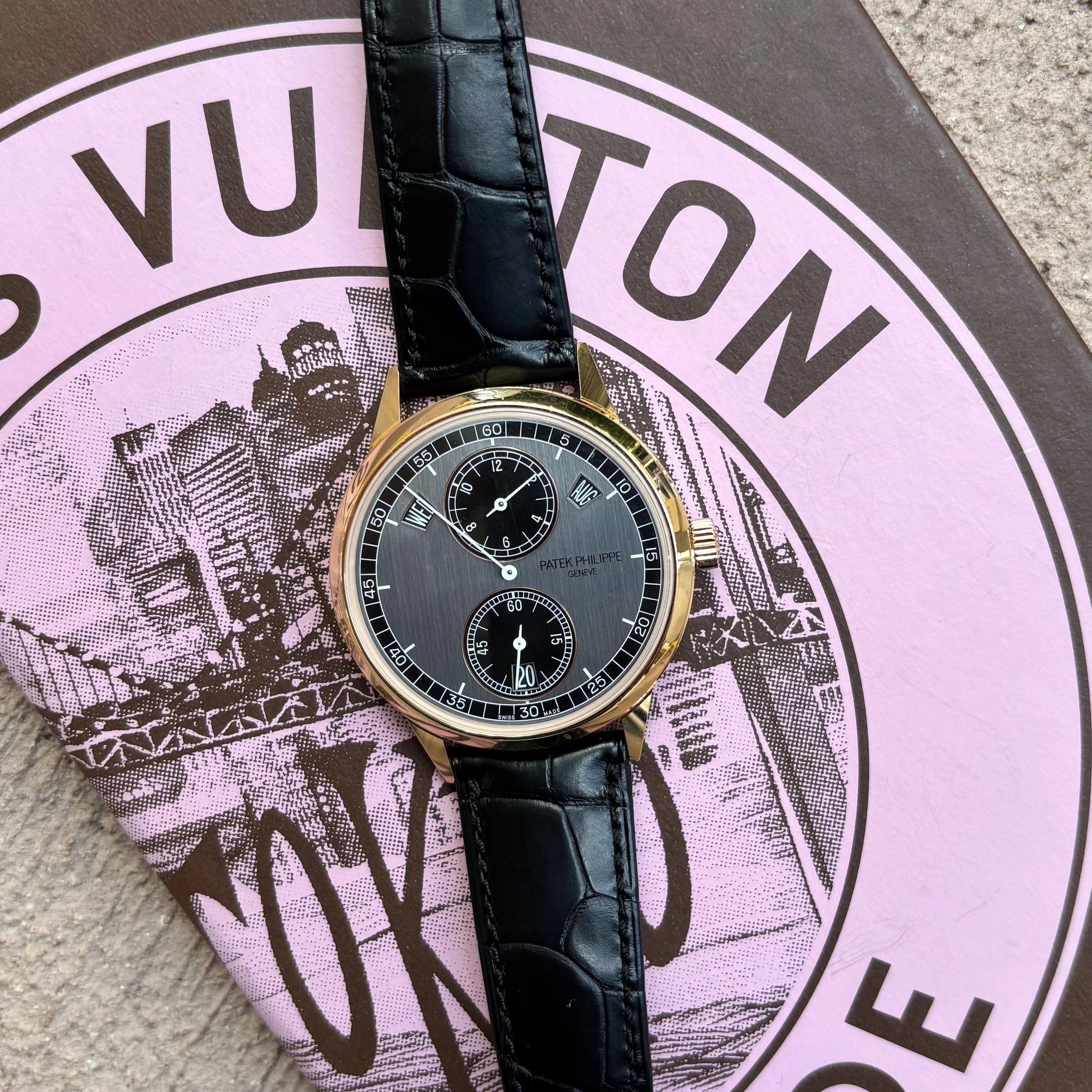 A rare expression of Patek Philippe’s technical innovation, the Complications 5235/50R-001 stands apart as one of the brand’s few modern regulator-style wristwatches, executed in 18k rose gold with a striking two-tone graphite and ebony black vertically satin-brushed dial. Introduced in 2019 to succeed the white gold 5235G, this exceptional timepiece marries classic haute horlogerie aesthetics with cutting-edge watchmaking innovation. Its signature regulator layout separates the hours at 12 o’clock, seconds at 6 o’clock, and a central minute hand, while the two-tone dial and crisp white transfer-printed markings exude understated sophistication.