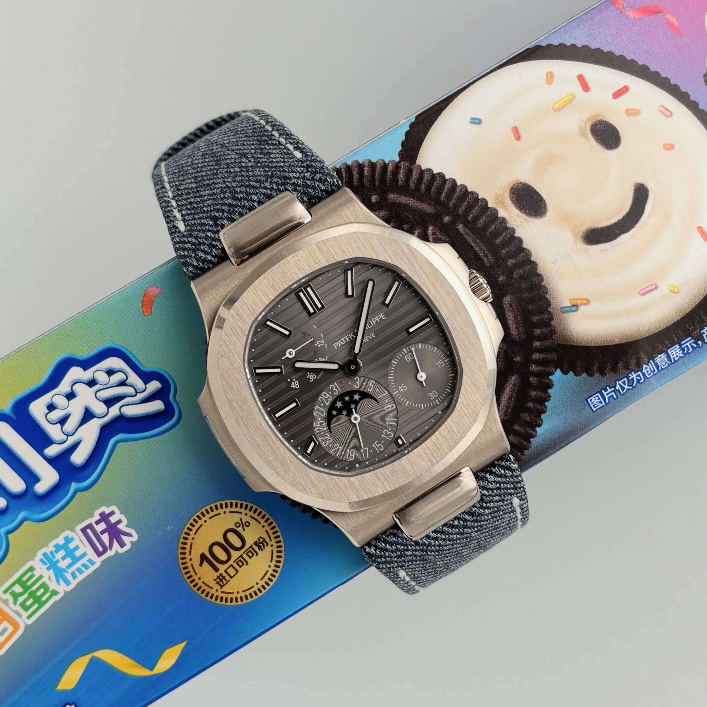 The Patek Philippe Nautilus 5712G-001 is a rare white gold icon, currently fitted with a bold denim strap that adds a modern, sporty twist to its timeless elegance. The 40mm 18k white gold case features a slate grey sunburst dial with horizontal embossing and a subtle black-gradient rim, highlighted by white gold applied hour markers with luminescent coating for optimal legibility. Its signature design balances sportiness with sophistication, while the denim strap—the same style used on the 5980 Denim model—adds a contemporary, casual flair to this classic Nautilus silhouette (original straps are included).
