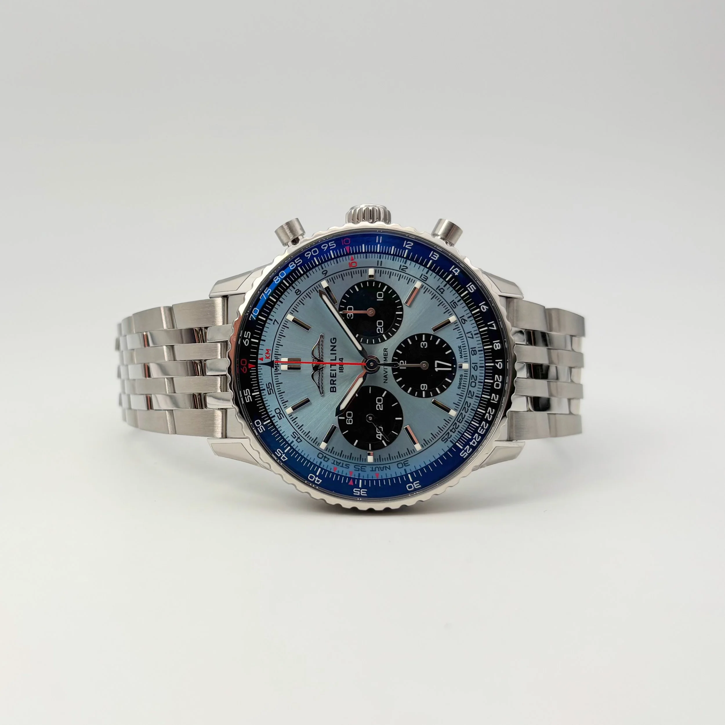 The watch is fitted with a stainless steel bracelet with a folding clasp, giving it a versatile, refined presence suitable for both daily wear and collection-level ownership. An enduring classic elevated by modern engineering, the Navitimer B01 Chronograph 43 is a cornerstone Breitling model—instantly recognizable, mechanically exceptional, and forever tied to aviation history. This piece is complete with its original box, travel pouch, instructions booklet, hang tag and warranty card.