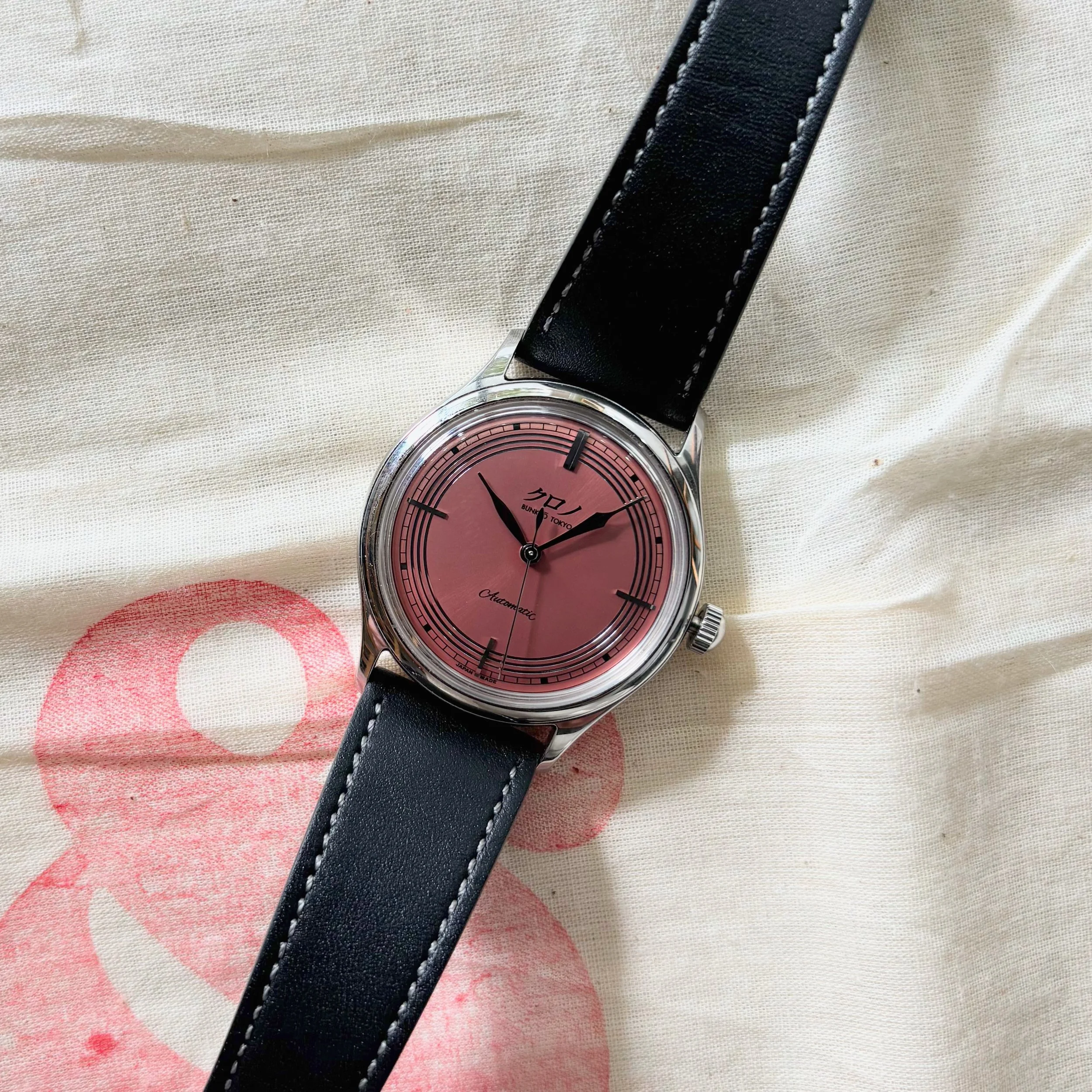 Released to celebrate Kurono Tokyo’s second anniversary, the Kurono Tokyo Anniversary 朱鷺 (Toki) is a refined and expressive timepiece that embodies Japanese artistry and symbolism. This pre-owned timepiece is crafted in a high-polished 37mm 316L stainless steel case measuring just 7mm thick (excluding the sapphire crystal), the watch features Kurono’s signature anniversary radial sunburst dial in a striking metallic salmon hue, shifting beautifully from crimson to vermillion red with subtle hints of purple under certain lighting. Inspired by the Japanese crested ibis—an auspicious symbol of happiness, good fortune, and the rising sun—the dial delivers remarkable depth and warmth. Powering the watch is the premium-grade Miyota 90S5 automatic movement, beating at 28,800 bph with a 40-hour power reserve and 24 jewels. Finished with a sapphire crystal, 3 ATM water resistance, and paired with a black calf leather strap (20/16mm), this Made-in-Japan anniversary edition is a tasteful blend of elegance, cultural storytelling, and modern independent watchmaking. The condition of this timepiece is very good, with the exception of minor superficial scratching throughout the case. This watch comes complete with its original boxes, accessories, and warranty card dated July 2021.